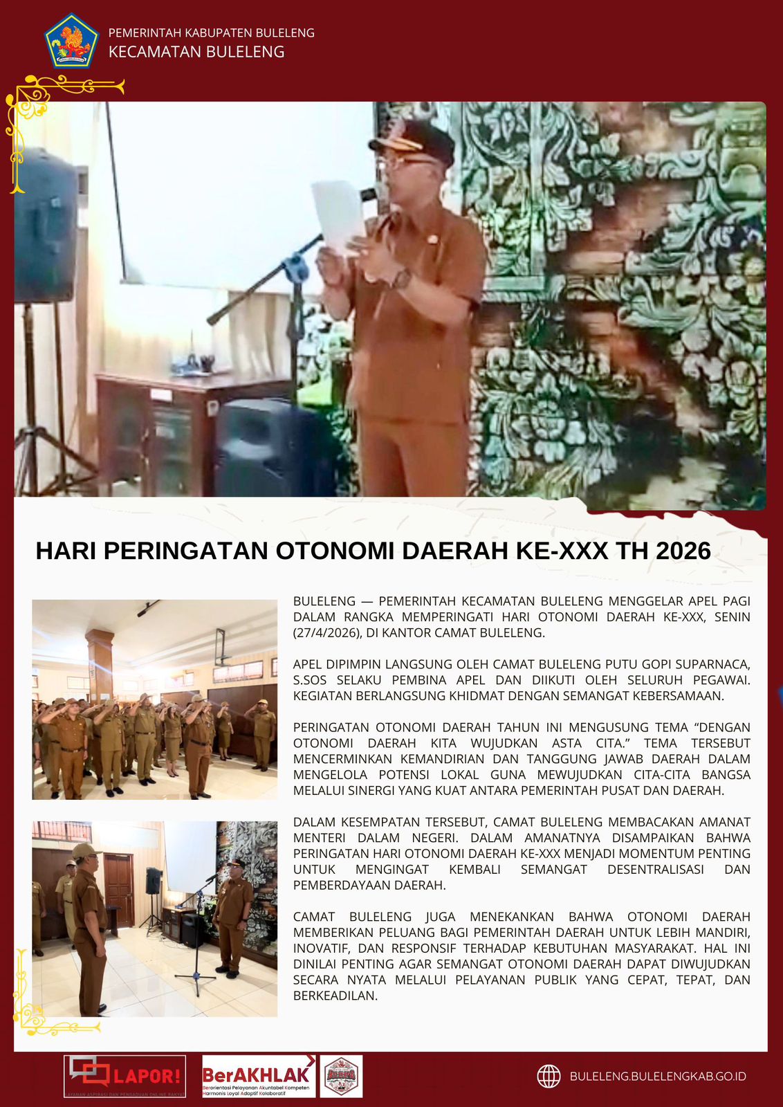 Buleleng — Pemerintah Kecamatan Buleleng menggelar apel pagi dalam rangka memperingati Hari Otonomi Daerah ke-XXX, Senin (27/4/2026), di Kantor Camat Buleleng.