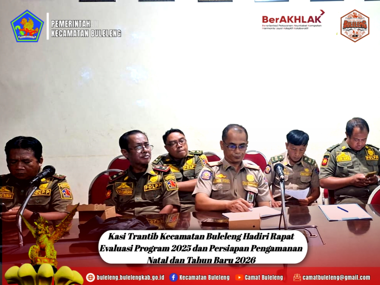 Senin, 15 Desember 2025, Kepala Seksi Ketenteraman dan Ketertiban Umum (Trantib) serta Satpol PP Kecamatan Buleleng, Amin Rois, S.Hut, menghadiri undangan Rapat Evaluasi Pelaksanaan Program dan Kegiatan Tahun 2025 yang dirangkaikan dengan Persiapan Pengamanan Natal 2025 dan Tahun Baru 2026 (Nataru). Kegiatan tersebut dilaksanakan di Ruang Rapat Kantor Satpol PP Kabupaten Buleleng.