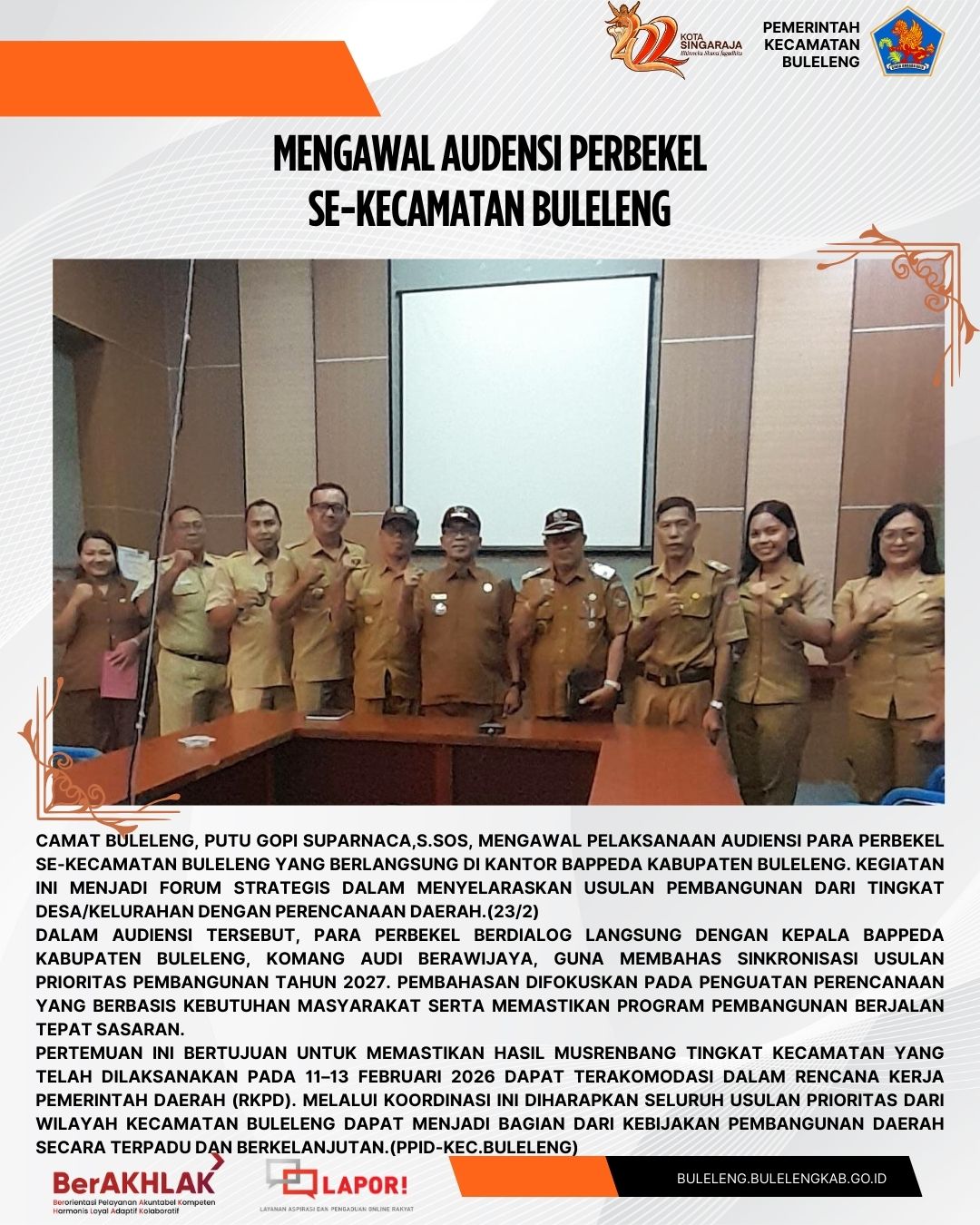 Camat Buleleng, Putu Gopi Suparnaca,S.Sos, mengawal pelaksanaan audiensi para perbekel se-Kecamatan Buleleng yang berlangsung di Kantor Bappeda Kabupaten Buleleng. Kegiatan ini menjadi forum strategis dalam menyelaraskan usulan pembangunan dari tingkat desa/kelurahan dengan perencanaan daerah. (23/2)