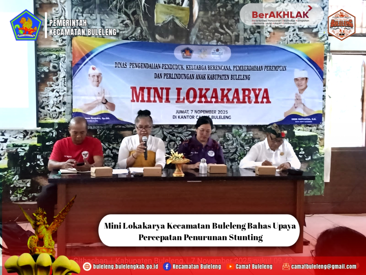 Dalam laporannya, disampaikan bahwa Mini Lokakarya kali ini merupakan pertemuan terakhir di tahun 2025, yang menjadi evaluasi bersama atas hasil pelaksanaan program percepatan penurunan stunting di wilayah Kecamatan Buleleng. Berdasarkan data yang dihimpun dari bulan Januari hingga September 2025, angka stunting menunjukkan peningkatan signifikan, dari 2,16% pada Juli menjadi 4,26% pada Agustus, dan sedikit naik menjadi 4,32% pada September 2025. Kenaikan tersebut dipengaruhi oleh beberapa faktor, antara lain: