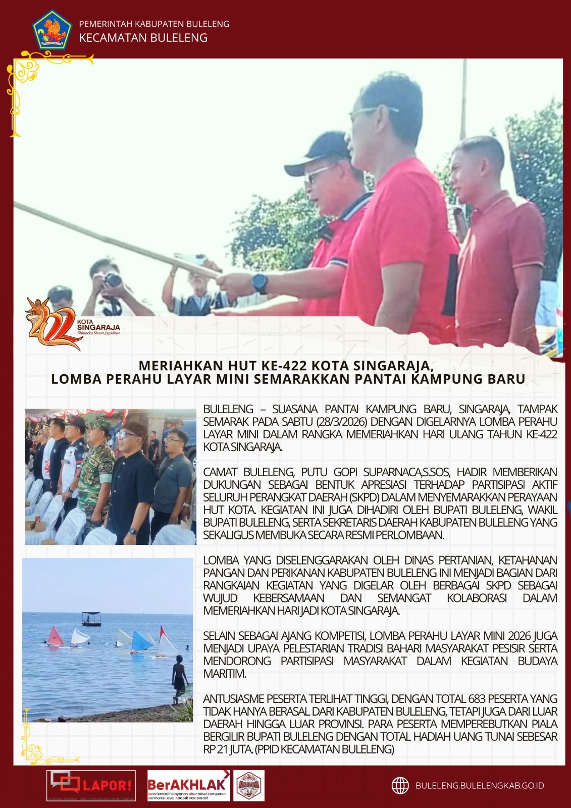 Buleleng - suasana Pantai Kampung Baru, Singaraja, tampak semarak pada Sabtu (28/3/2026) dengan digelarnya lomba perahu layar mini dalam rangka memeriahkan hari ulang tahun ke-422 Kota Singaraja.