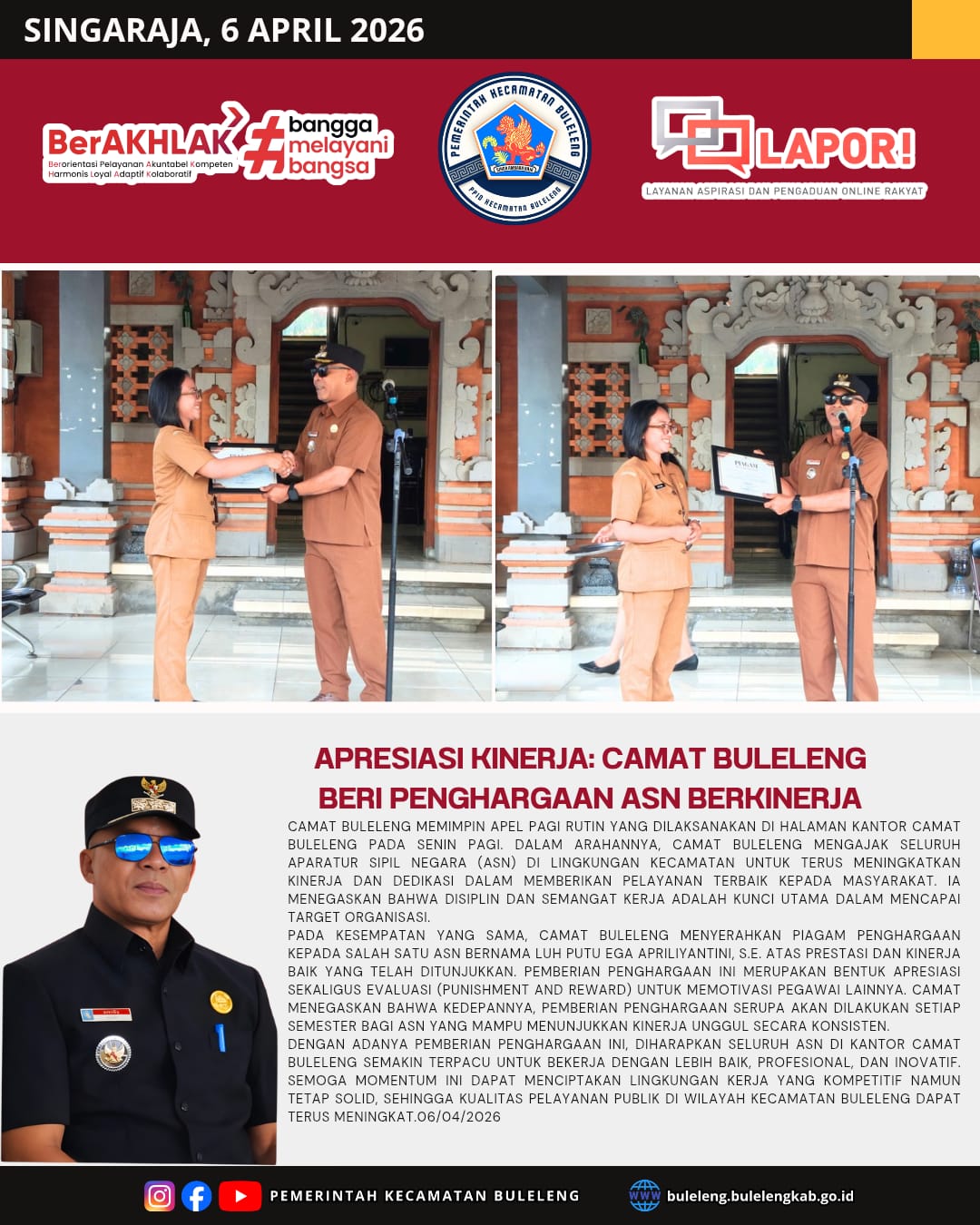 Dengan adanya pemberian penghargaan ini, diharapkan seluruh ASN di Kantor Camat Buleleng semakin terpacu untuk bekerja dengan lebih baik, profesional, dan inovatif. Semoga momentum ini dapat menciptakan lingkungan kerja yang kompetitif namun tetap solid, sehingga kualitas pelayanan publik di wilayah Kecamatan Buleleng dapat terus meningkat. 06/04/2026