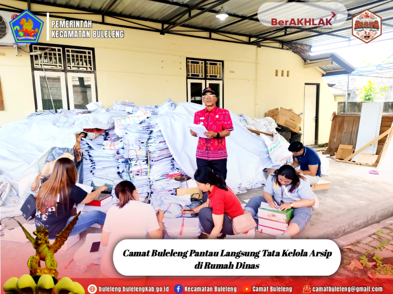 Selasa, 25 November 2025 — Camat Buleleng, Putu Gopi Suparnaca, S.Sos tampak hadir memantau secara langsung kegiatan tata kelola arsip yang berlangsung di Rumah Dinas Camat Buleleng. Kegiatan ini dikoordinir oleh Kepala Sub Bagian Umum dan Keuangan dan melibatkan seluruh staf Kantor Camat Buleleng yang telah dijadwalkan dalam beberapa shift kerja.