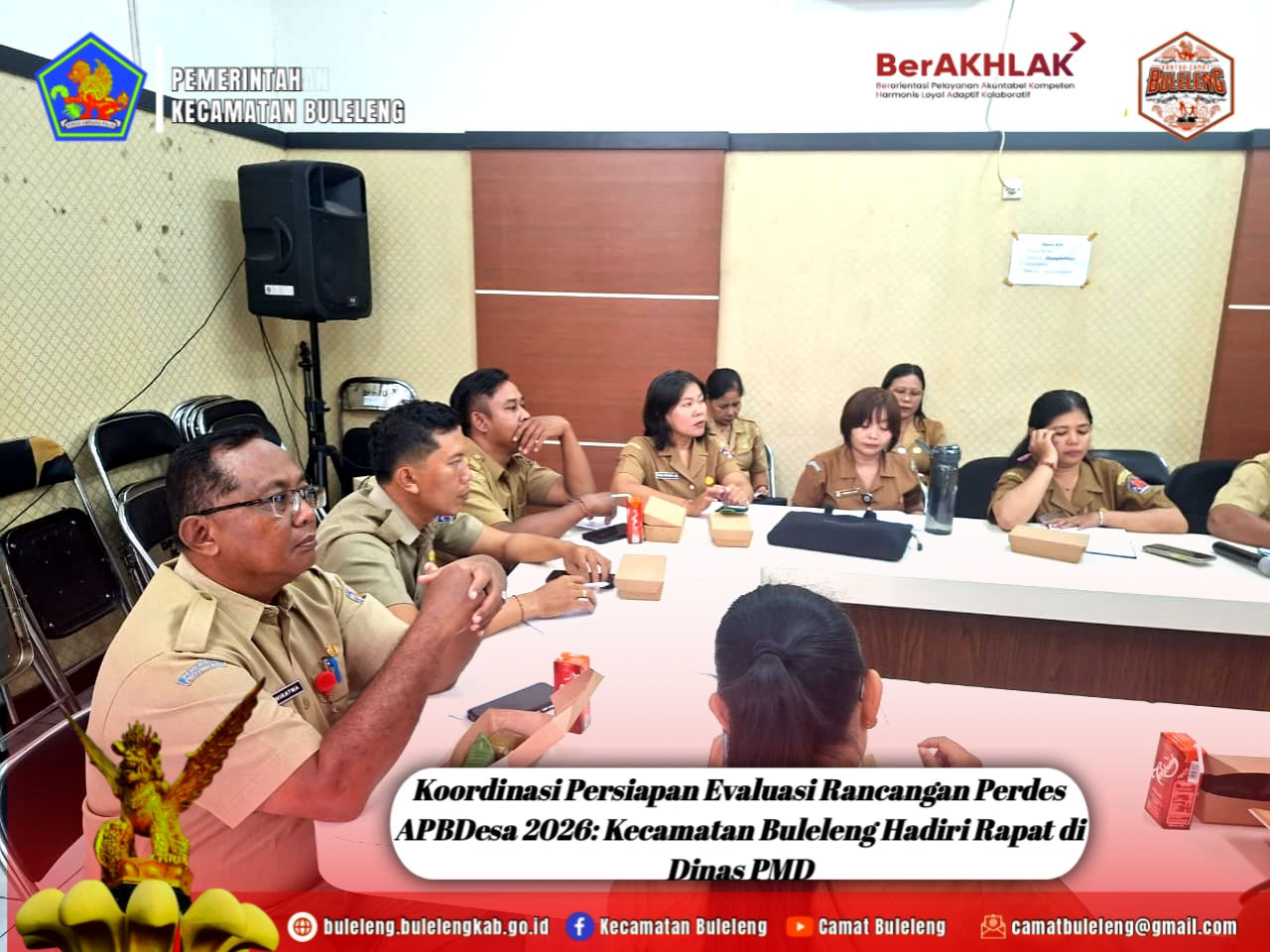 Senin, 24 November 2025 – Bertempat di Ruang Rapat Dinas Pemberdayaan Masyarakat dan Desa (PMD) Kabupaten Buleleng, Kasi Pemerintahan Kecamatan Buleleng Gede Susena, S.E bersama Kasi Pembangunan Anak Agung Ngurah Wiratma, S.H menghadiri undangan koordinasi persiapan Evaluasi Rancangan Peraturan Desa tentang APBDesa Tahun 2026.
