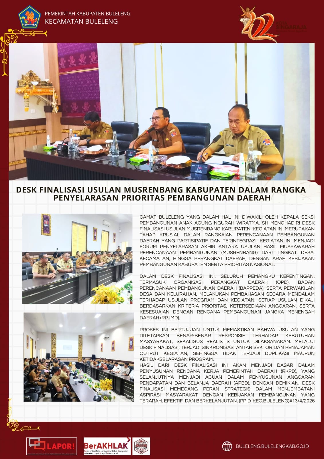 Hasil dari desk finalisasi ini akan menjadi dasar dalam penyusunan Rencana Kerja Pemerintah Daerah (RKPD), yang selanjutnya menjadi acuan dalam penyusunan Anggaran Pendapatan dan Belanja Daerah (APBD). Dengan demikian, desk finalisasi memegang peran strategis dalam menjembatani aspirasi masyarakat dengan kebijakan pembangunan yang terarah, efektif, dan berkelanjutan. (PPID-Kec. Buleleng) #13/4/2026
