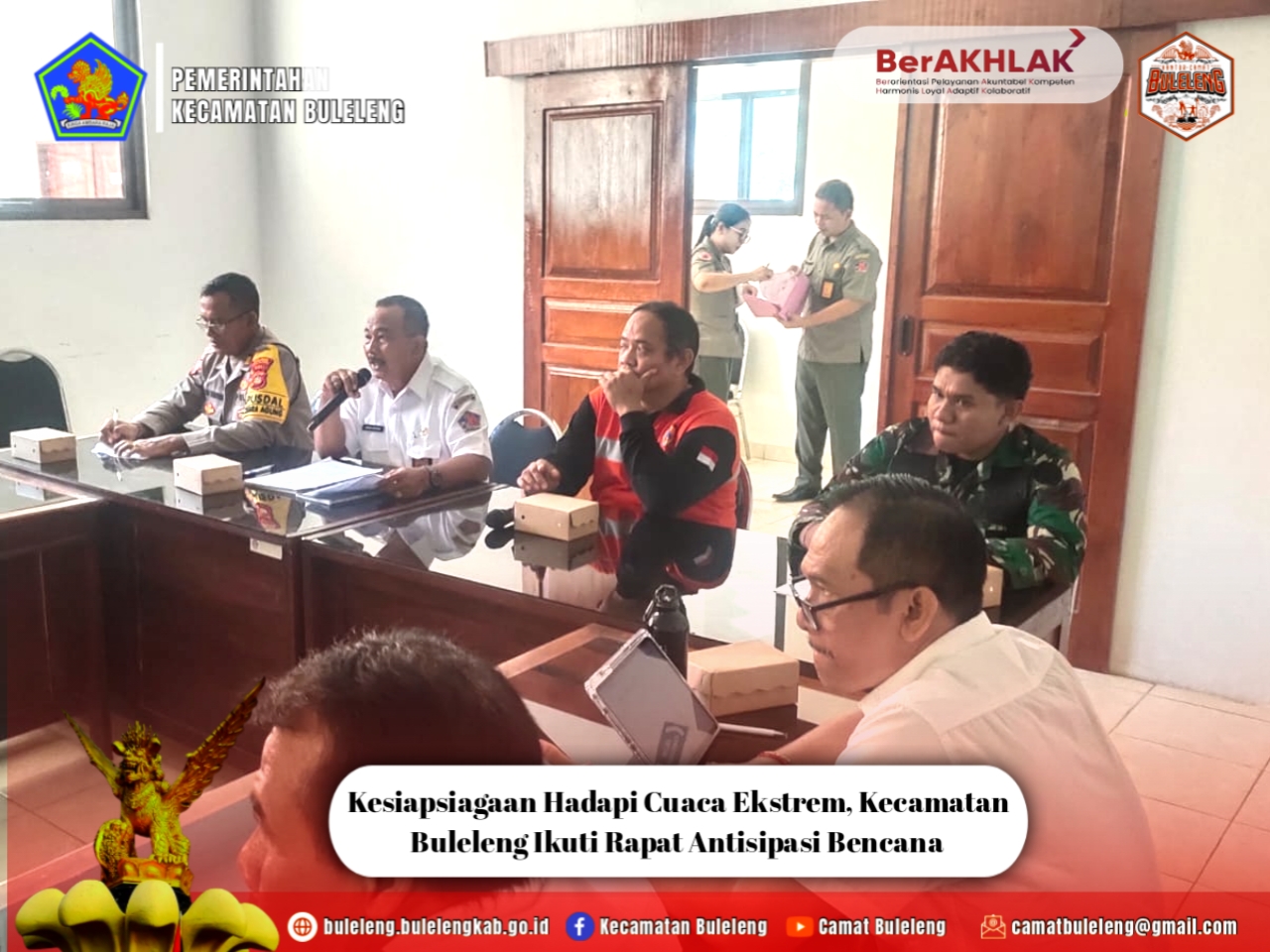 Buleleng, Rabu 26 November 2025 – Kasi Trantib dan Pol PP Kecamatan Buleleng, Amin Rois, S.Hut, menghadiri Rapat Kesiapsiagaan Antisipasi Cuaca Ekstrem serta Bencana Alam dan Non-Alam yang diselenggarakan di Ruang Rapat Kantor Badan Penanggulangan Bencana Daerah (BPBD) Kabupaten Buleleng, Jalan Satria Darma, Desa Tukadmungga.