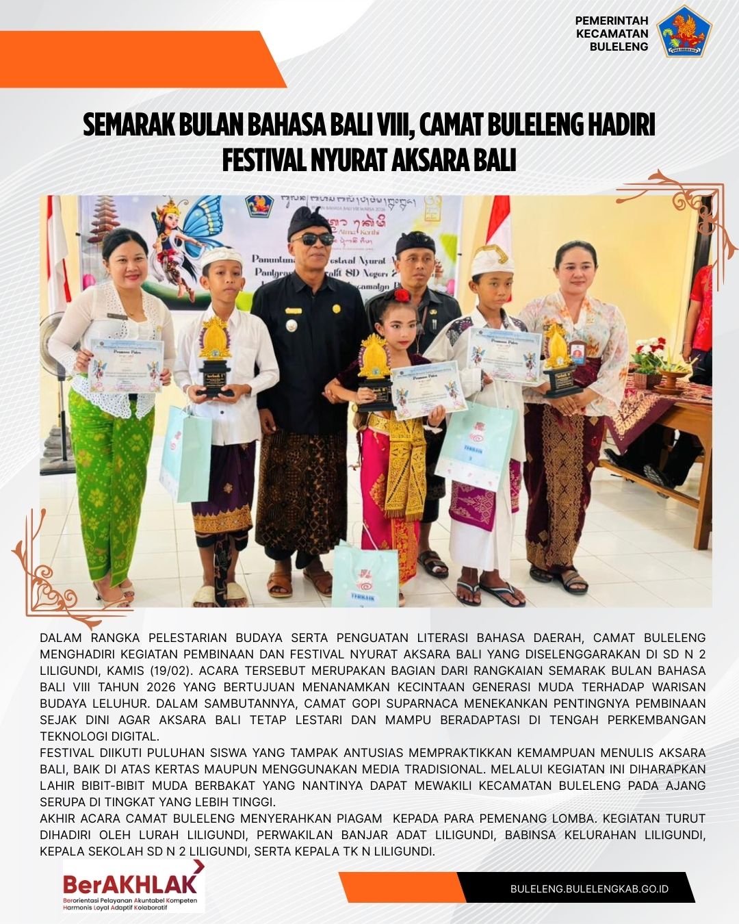 Dalam rangka pelestarian budaya serta penguatan literasi bahasa daerah, Camat Buleleng menghadiri kegiatan pembinaan dan Festival Nyurat Aksara Bali yang diselenggarakan di SD N 2 Liligundi, Kamis (19/02).