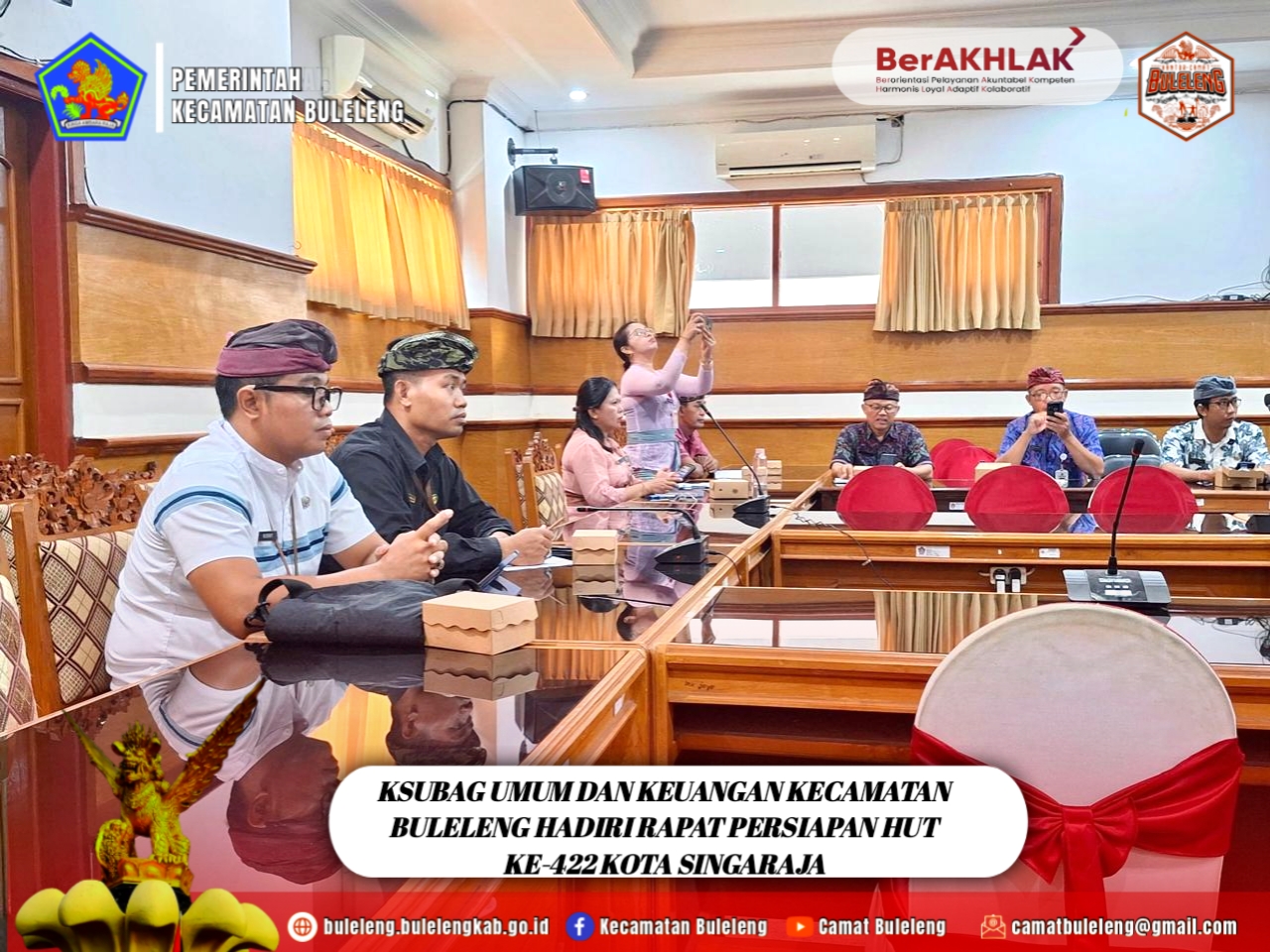 Kamis, 29 Januari 2026, Kepala Sub Bagian Umum dan Keuangan Kecamatan Buleleng, Putu Tegeh Koriadi, S.E., M.Si, mewakili Camat Buleleng menghadiri Rapat Persiapan Hari Ulang Tahun (HUT) ke-422 Kota Singaraja yang dilaksanakan di Ruang Rapat Setda Kabupaten Buleleng.