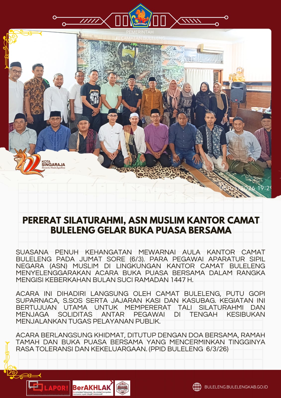 Suasana penuh kehangatan mewarnai Aula Kantor Camat Buleleng pada Jumat sore (6/3). Para pegawai Aparatur Sipil Negara (ASN) Muslim di lingkungan Kantor Camat Buleleng menyelenggarakan acara buka puasa bersama dalam rangka mengisi keberkahan bulan suci Ramadan 1447 H.