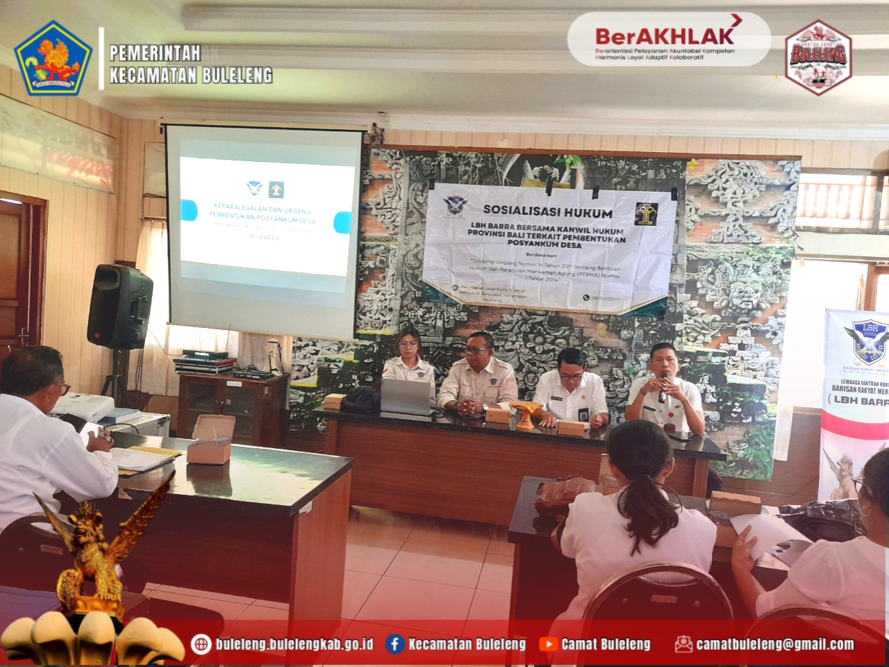 Acara ini diselenggarakan oleh Dinas Pemberdayaan Masyarakat dan Desa (PMD) Kabupaten Buleleng bekerja sama dengan Lembaga Bantuan Hukum Barisan Rakyat Merdeka (LBH BARRA) serta Kantor Wilayah Kementerian Hukum dan HAM Provinsi Bali. Hadir dalam kesempatan tersebut Kepala Bidang Pemerintahan Desa Dinas PMD, Madong Hartono, S.Pd., bersama jajaran narasumber dari LBH BARRA dan Kanwil Hukum Bali.