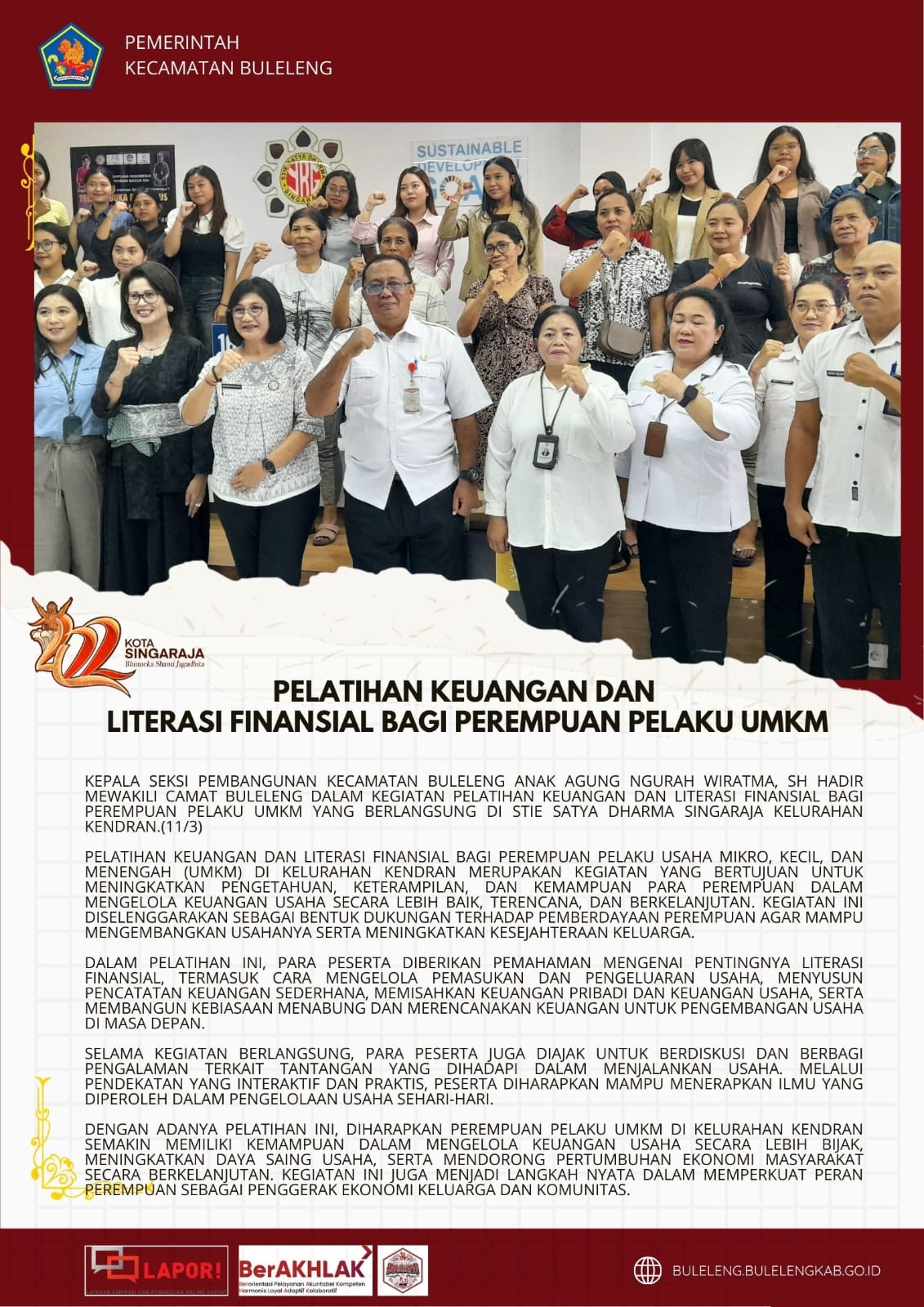 Kepala Seksi Pembangunan Kecamatan Buleleng Anak Agung Ngurah Wiratma, SH hadir mewakili Camat Buleleng dalam kegiatan Pelatihan Keuangan dan Literasi Finansial bagi Perempuan Pelaku UMKM yang berlangsung di STIE Satya Dharma Singaraja, Kelurahan Kendran. (11/3)