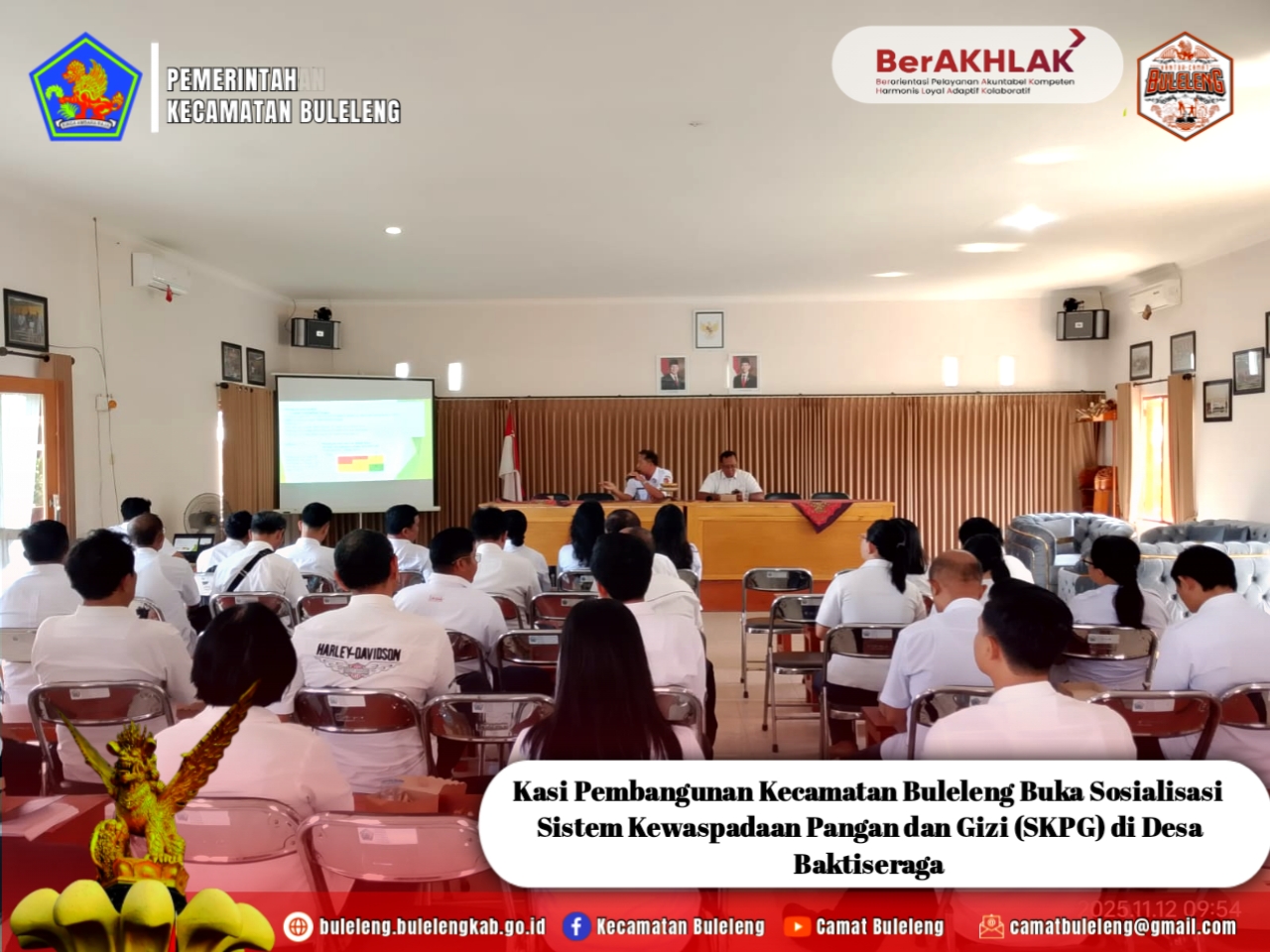 Buleleng, Rabu (12/11/2025) — Kepala Seksi Pembangunan Kecamatan Buleleng, Anak Agung Ngurah Wiratma, S.H, menghadiri sekaligus membuka kegiatan Sosialisasi dan Koordinasi Sistem Kewaspadaan Pangan dan Gizi (SKPG) yang berlangsung di aula Kantor Desa Baktiseraga.