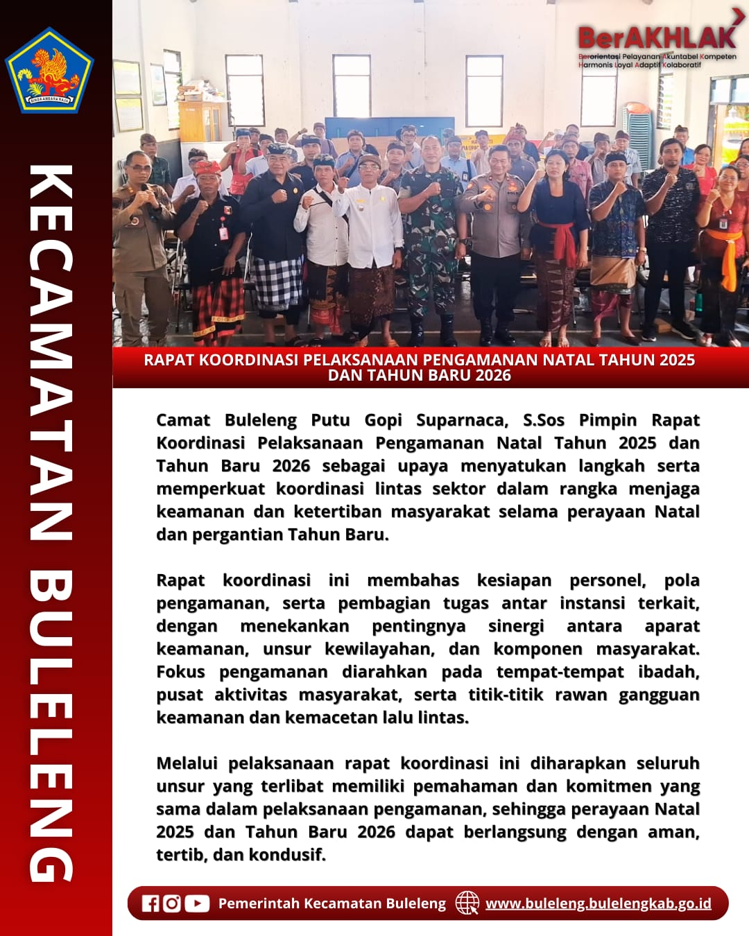 Buleleng — Kecamatan Buleleng menggelar Rapat Koordinasi Pelaksanaan Pengamanan Perayaan Natal Tahun 2025 dan Tahun Baru 2026, Kamis (11/12/2025), bertempat di Gedung Serba Guna Kantor Lurah Banjar Jawa. Rapat dipimpin langsung oleh Camat Buleleng dan dihadiri unsur TNI/Polri, pemerintah desa/kelurahan, serta unsur adat se-Kecamatan Buleleng.