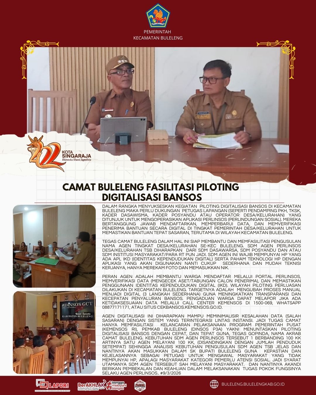Agen digitalisasi ini diharapkan mampu meminimalisir kesalahan data (salah sasaran) dengan sistem yang terintegrasi lintas instansi. Jadi tugas camat hanya memfasilitasi kelancaran pelaksanaan program pemerintah pusat (Kemensos RI) dan Pemkab Buleleng (Dinsos P3A), yakni menuntaskan piloting digitalisasi bansos dengan cepat dan tepat guna.
