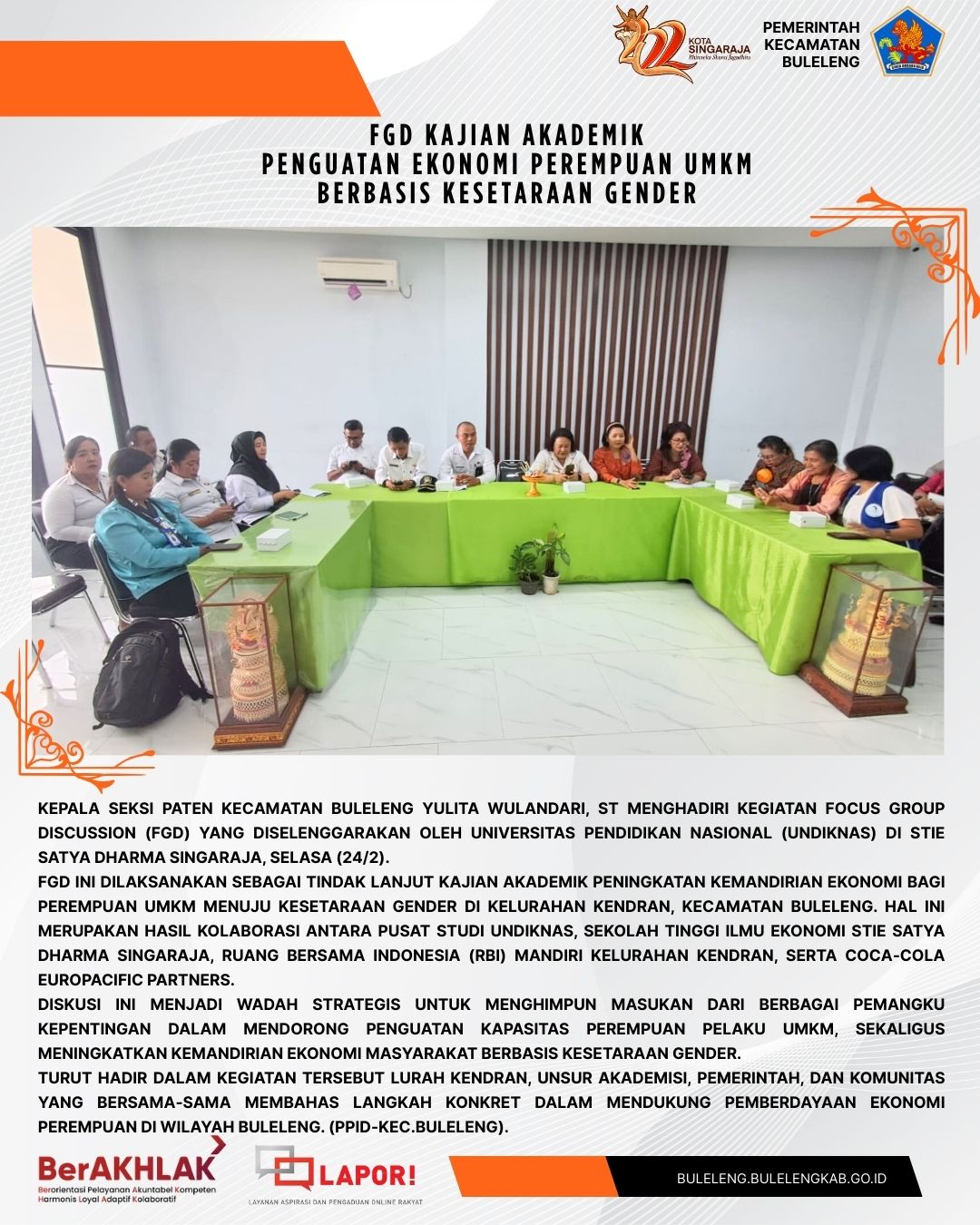 FGD ini dilaksanakan sebagai tindak lanjut kajian akademik peningkatan kemandirian ekonomi bagi perempuan UMKM menuju kesetaraan gender di Kelurahan Kendran, Kecamatan Buleleng. Hal ini merupakan hasil kolaborasi antara Pusat Studi Undiknas, Sekolah Tinggi Ilmu Ekonomi STIE Satya Dharma Singaraja, Ruang Bersama Indonesia (RBI) Mandiri Kelurahan Kendran, serta Coca-Cola Europacific Partners.