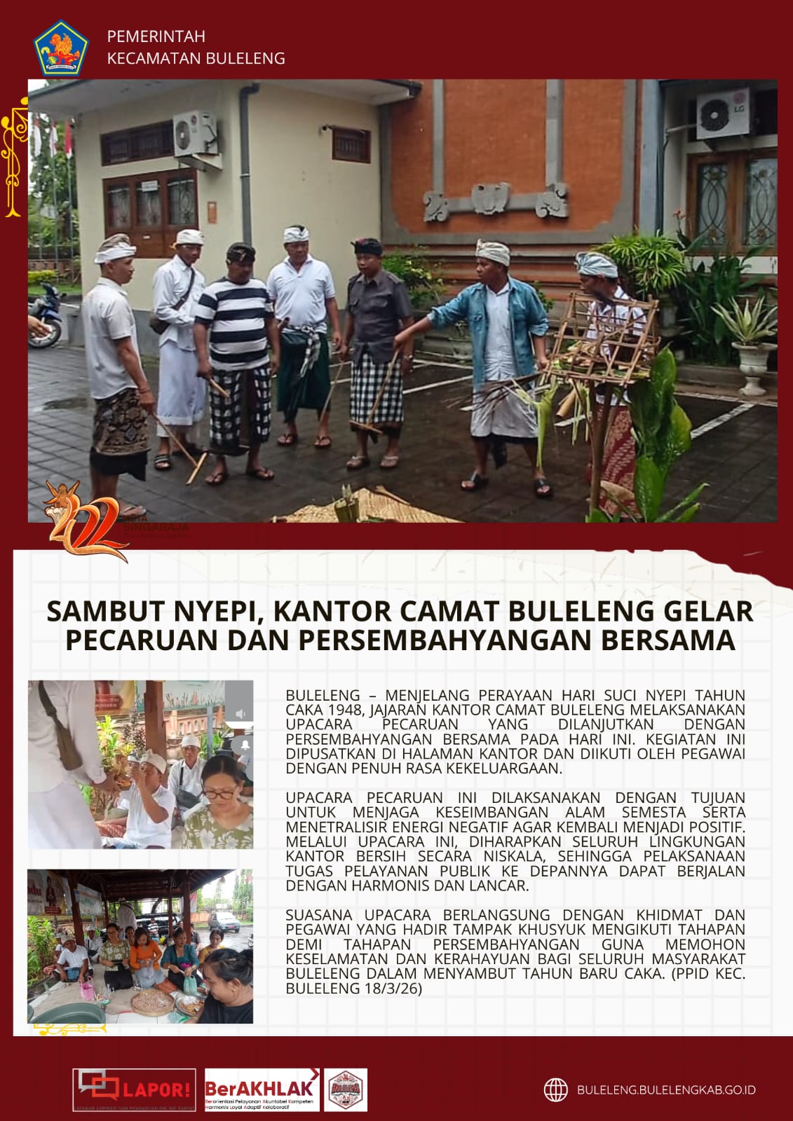Buleleng - menjelang perayaan Hari Suci Nyepi Tahun Caka 1948, jajaran Kantor Camat Buleleng melaksanakan upacara pecaruan yang dilanjutkan dengan persembahyangan bersama pada hari ini. Kegiatan ini dipusatkan di halaman kantor dan diikuti oleh pegawai dengan penuh rasa kekeluargaan.