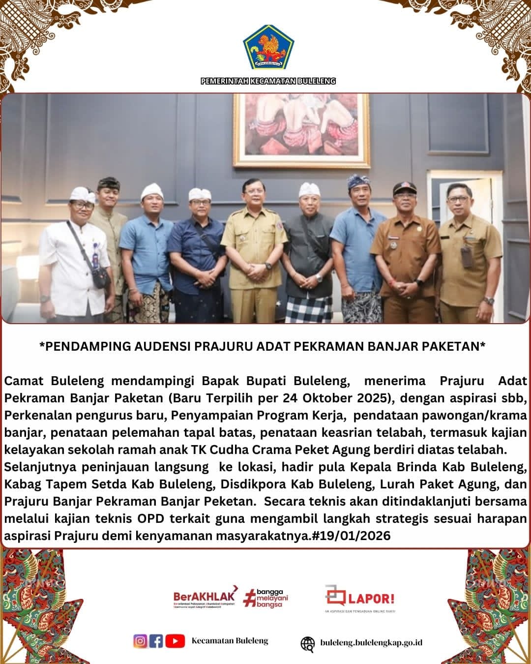 Buleleng – Senin, 19 Januari 2026, Camat Buleleng Putu Gopi Suparnaca, S.Sos mendampingi Bupati Buleleng dalam menerima audiensi Prajuru Adat Pakraman Banjar Paketan yang baru terpilih per 24 Oktober 2025. Audiensi tersebut berlangsung dalam suasana dialogis sebagai wadah penyampaian aspirasi serta penguatan sinergi antara pemerintah daerah dan desa adat.