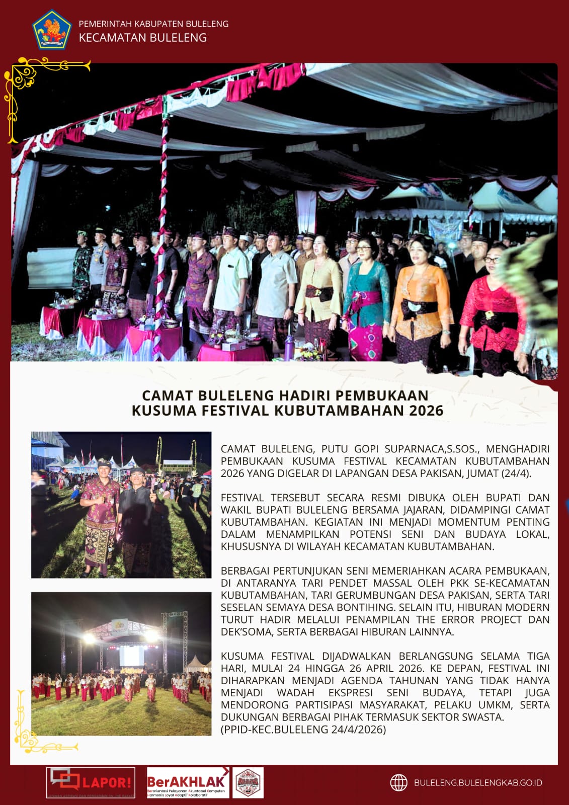 Camat Buleleng, Putu Gopi Suparnaca, S.Sos., menghadiri pembukaan Kusuma Festival Kecamatan Kubutambahan 2026 yang digelar di Lapangan Desa Pakisan, Jumat (24/4).