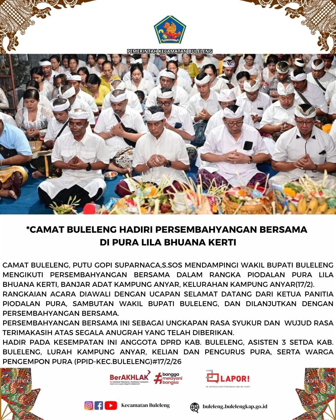 Camat Buleleng, Putu Gopi Suparnaca,S.Sos mendampingi Wakil Bupati Buleleng mengikuti persembahyangan bersama dalam rangka piodalan Pura Lila Bhuana Kerti, Banjar Adat Kampung Anyar, Kelurahan Kampung Anyar (17/2).