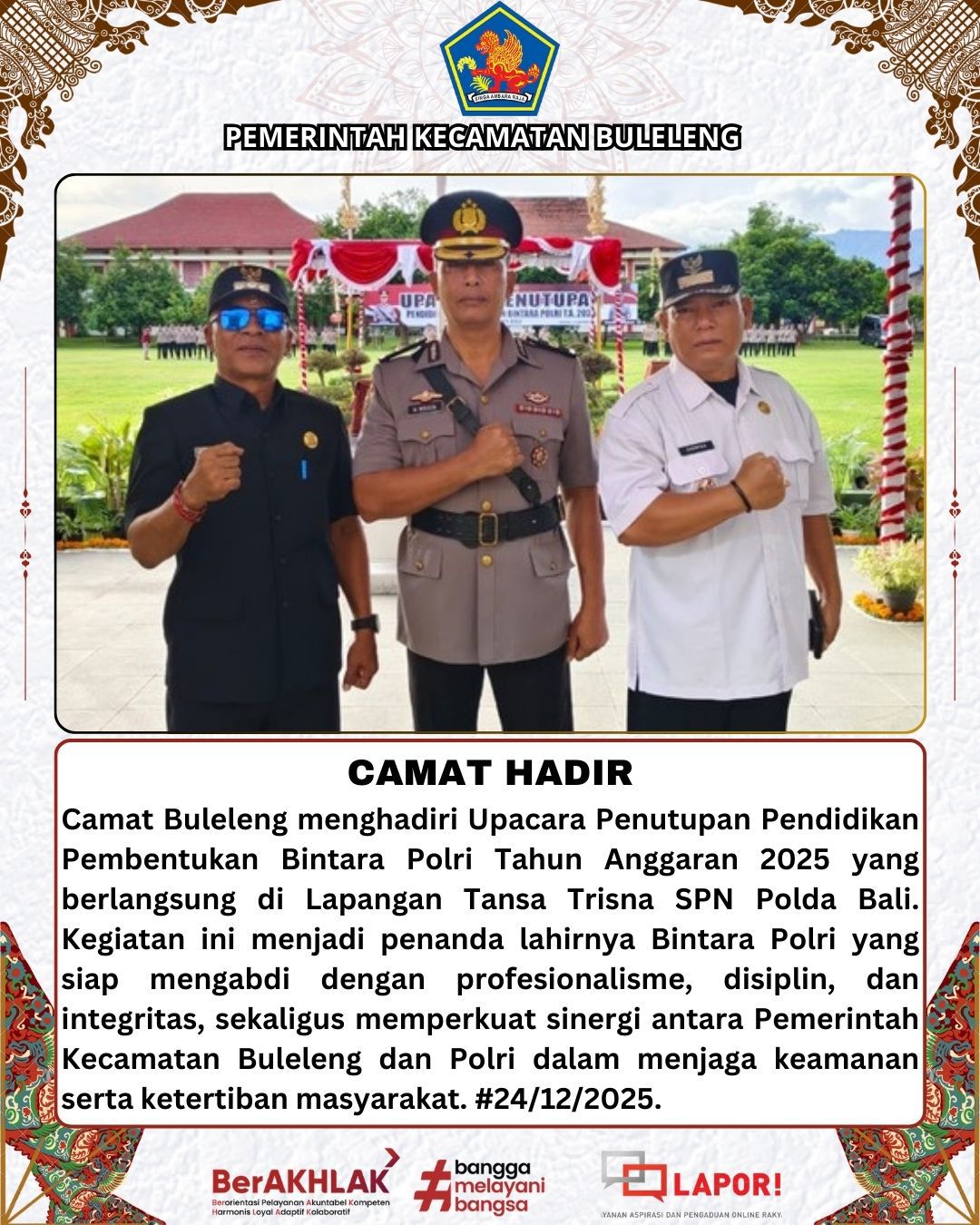 Buleleng, Rabu (24/12/2025) — Camat Buleleng Putu Gopi Suparnaca, S.Sos menghadiri Upacara Penutupan Pendidikan Pembentukan Bintara Polri Tahun Anggaran 2025 yang dilaksanakan di Lapangan Tansa Trisna, Sekolah Polisi Negara (SPN) Polda Bali.