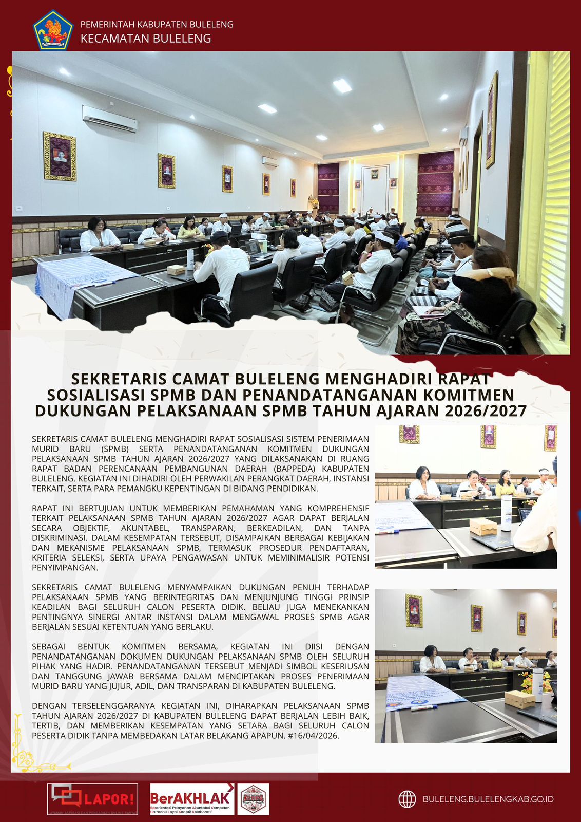 Sekretaris Camat Buleleng menghadiri rapat sosialisasi Sistem Penerimaan Murid Baru (SPMB) serta penandatanganan komitmen dukungan pelaksanaan SPMB Tahun Ajaran 2026/2027 yang dilaksanakan di Ruang Rapat Badan Perencanaan Pembangunan Daerah (Bappeda) Kabupaten Buleleng. Kegiatan ini dihadiri oleh perwakilan perangkat daerah, instansi terkait, serta para pemangku kepentingan di bidang pendidikan.