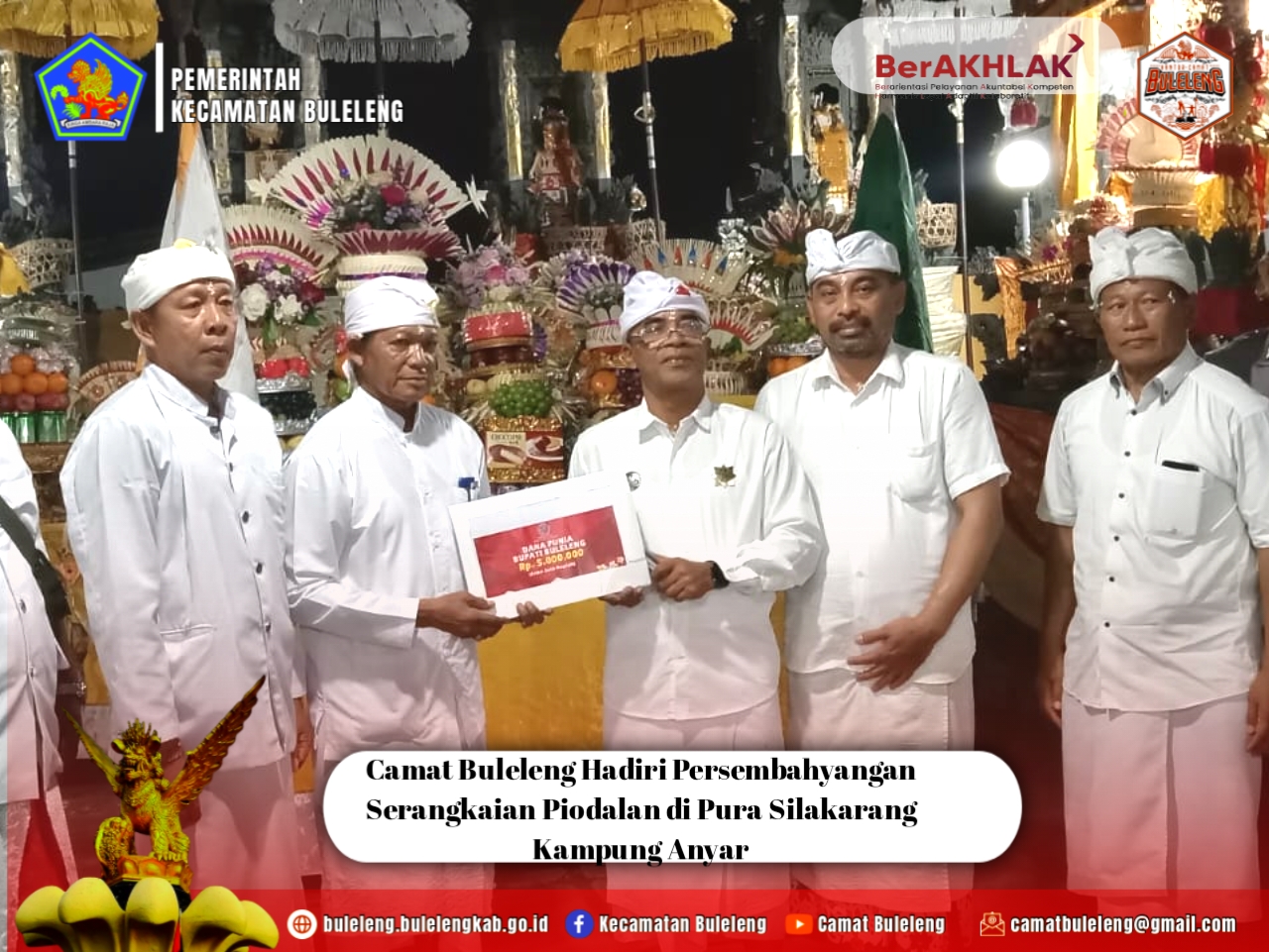 Dalam kegiatan tersebut, Camat Buleleng didampingi oleh Staf Seksi Sosial dan Budaya Kecamatan Buleleng, Gede Sucita, serta turut hadir Lurah Kampung Anyar bersama para Kepala Lingkungan, Kelian Adat, Ketua LPM, Babinkamtibmas, Babinsa, tokoh masyarakat, serta prajuru Pura Silakarang.