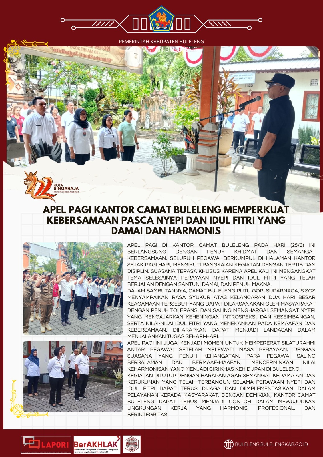 Apel pagi di Kantor Camat Buleleng pada hari (25/3) ini berlangsung dengan penuh khidmat dan semangat kebersamaan. Seluruh pegawai berkumpul di halaman kantor sejak pagi hari, mengikuti rangkaian kegiatan dengan tertib dan disiplin. Suasana terasa khusus karena apel kali ini mengangkat tema selesainya perayaan Nyepi dan Idul Fitri yang telah berjalan dengan santun, damai, dan penuh makna.
