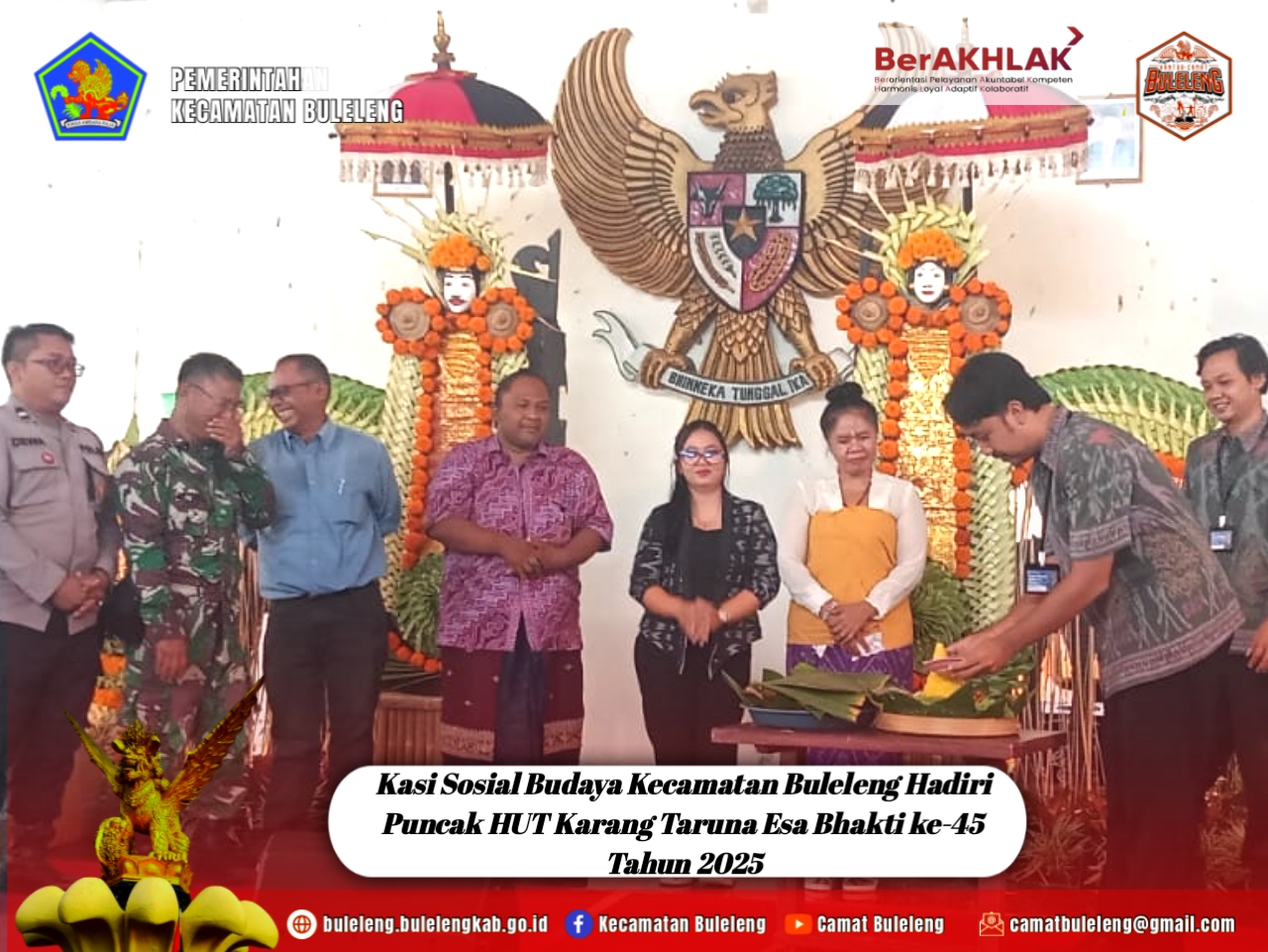 Kepala Seksi Sosial dan Budaya Kecamatan Buleleng, Ni Ketut Suryaniti, M.Si, mewakili Camat Buleleng menghadiri Puncak Peringatan Hari Ulang Tahun (HUT) Karang Taruna Esa Bhakti ke-45 Tahun 2025 yang dilaksanakan pada Minggu, 21 Desember 2025. Kegiatan ini berlangsung di Gedung Serba Guna belakang Kantor Lurah Banjar Jawa.