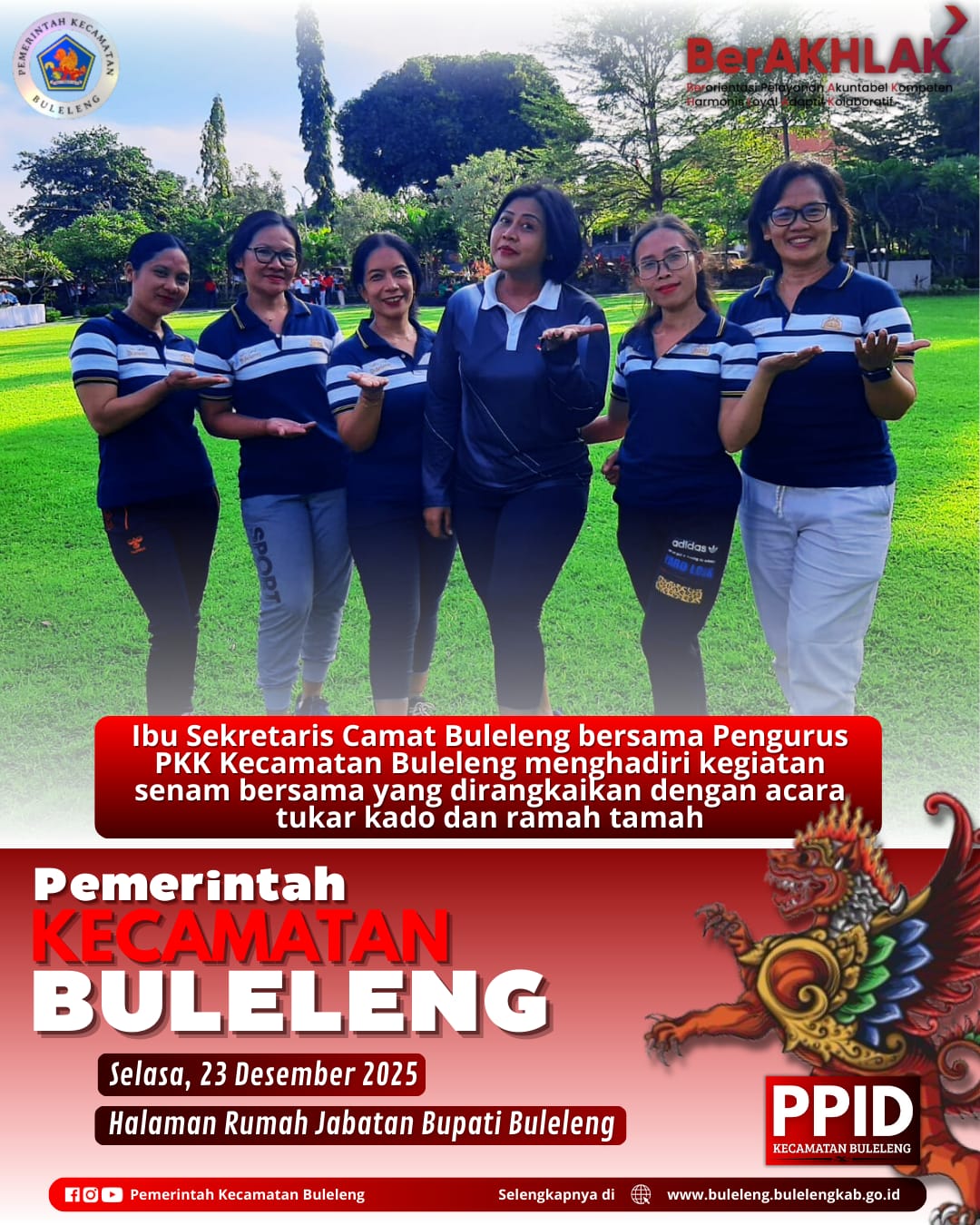 Buleleng, Selasa (23/12/2025) — Sekretaris Camat Buleleng, Ni Putu Sri Sundariani, S.STP., M.E, bersama Pengurus PKK Kecamatan Buleleng menghadiri kegiatan senam bersama yang dirangkaikan dengan acara tukar kado dan ramah tamah. Kegiatan tersebut dilaksanakan di Rumah Jabatan Bupati Buleleng.