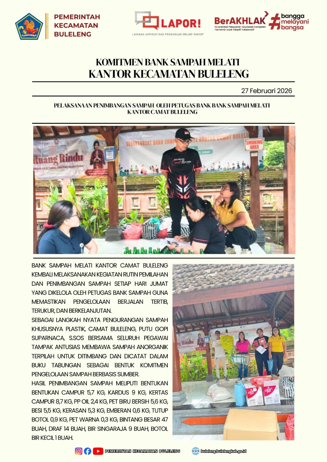 Bank Sampah Melati Kantor Camat Buleleng kembali melaksanakan kegiatan rutin pemilahan dan penimbangan sampah setiap hari Jumat yang dikelola oleh petugas bank sampah guna memastikan pengelolaan berjalan tertib, terukur, dan berkelanjutan.