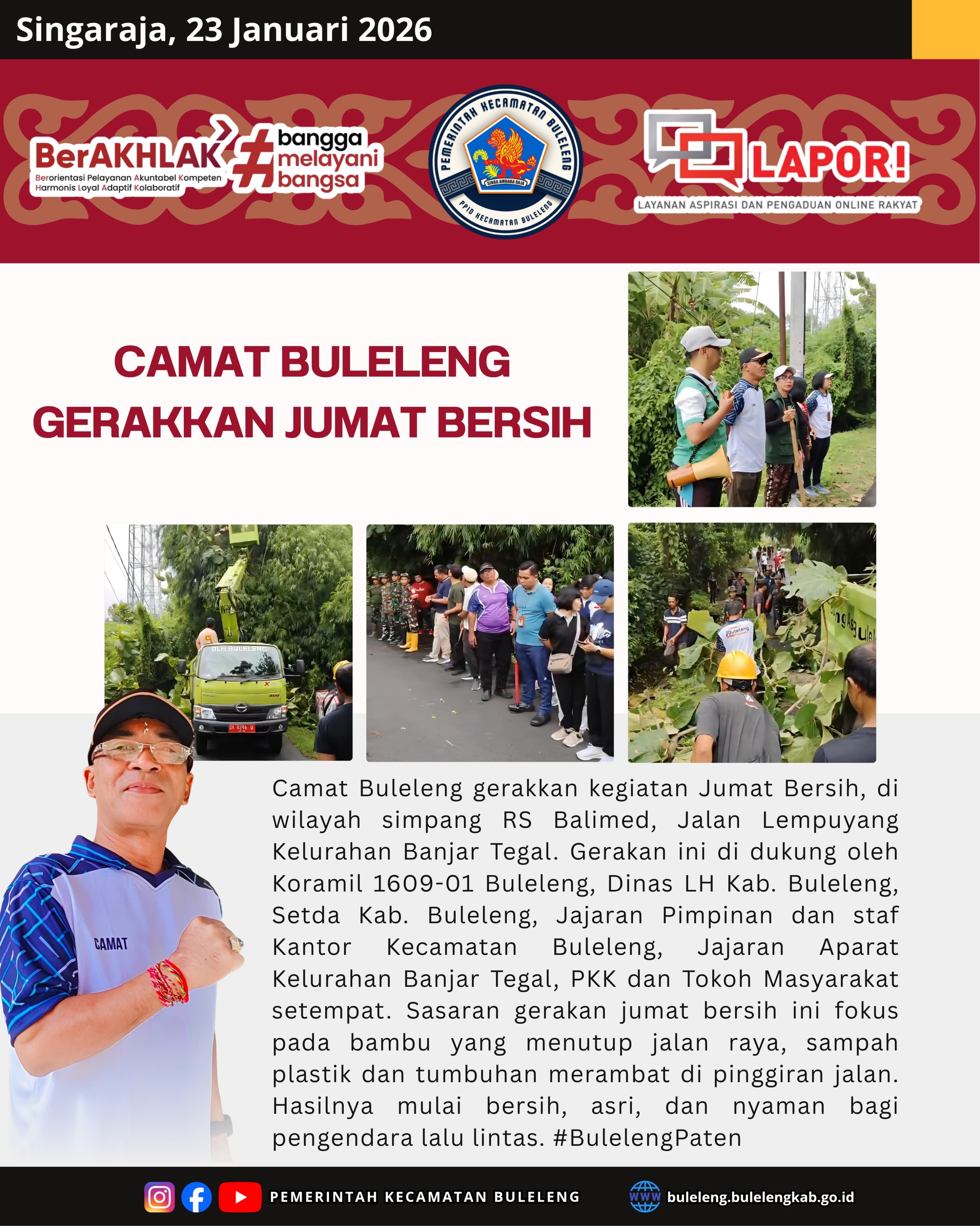 Buleleng — Dalam upaya menciptakan lingkungan yang bersih, asri, dan nyaman, Camat Buleleng Putu Gopi Suparnaca, S.Sos menggerakkan kegiatan Jumat Bersih pada Jumat, 23 Januari 2026. Kegiatan gotong royong ini dilaksanakan bersama seluruh staf Kecamatan Buleleng dan berlokasi di wilayah simpang Rumah Sakit Balimed, Jalan Lempuyang, Kelurahan Banjar Tegal.