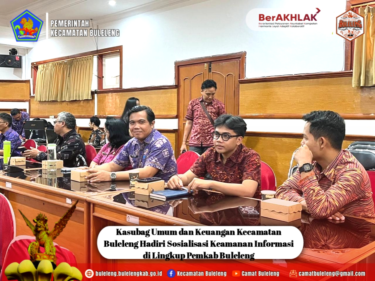 Buleleng, Selasa (11/11/2025) — Kasubag Umum dan Keuangan Kecamatan Buleleng, Putu Tegeh Koriadi, S.E., M.Si, menghadiri serangkaian undangan Rapat Sosialisasi Keamanan Informasi dan Edukasi Peningkatan Kesadaran Keamanan Informasi di lingkungan Pemerintah Daerah Kabupaten Buleleng Tahun 2025.
