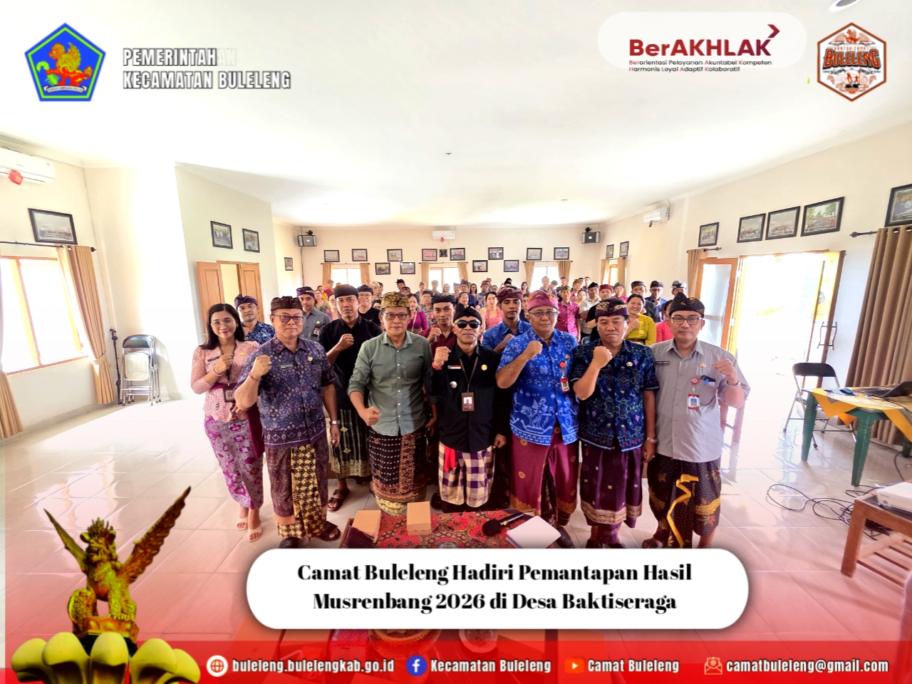 Baktiseraga, Kamis (6/11/2025) – Camat Buleleng Putu Gopi Suparnaca, S.Sos didampingi Kepala Seksi Pembangunan Kecamatan Buleleng Anak Agung Ngurah Wiratma, S.H., menghadiri kegiatan Pemantapan Hasil Musyawarah Perencanaan Pembangunan (Musrenbang) Tahun 2026 yang berlangsung di Aula Ruang Rapat Kantor Desa Baktiseraga.