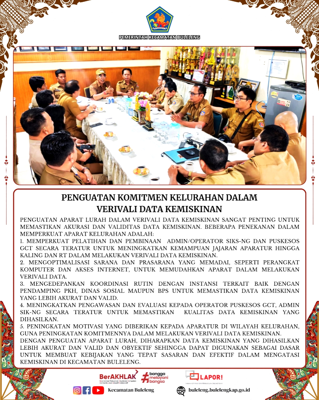 Dengan penguatan aparat lurah, diharapkan data kemiskinan yang dihasilkan lebih akurat, valid, dan objektif sehingga dapat digunakan sebagai dasar dalam membuat kebijakan yang tepat sasaran dan efektif dalam mengatasi kemiskinan di Kecamatan Buleleng.