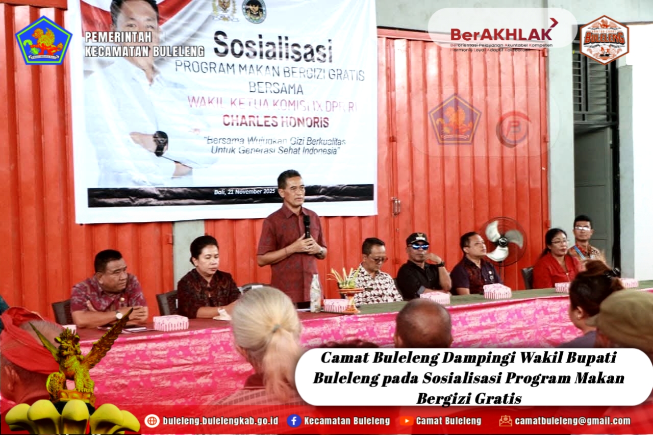 Jumat, 21 November 2025 – Camat Buleleng Putu Gopi Suparnaca, S.Sos menghadiri serta mendampingi Wakil Bupati Buleleng dalam kegiatan Sosialisasi Program Makan Bergizi Gratis (MBG) dari Badan Gizi Nasional (BGN) yang diselenggarakan oleh Wakil Ketua Komisi IX DPR RI, Charles Honoris, bertempat di Aula/Balai Banjar Adat Banjar Bali.