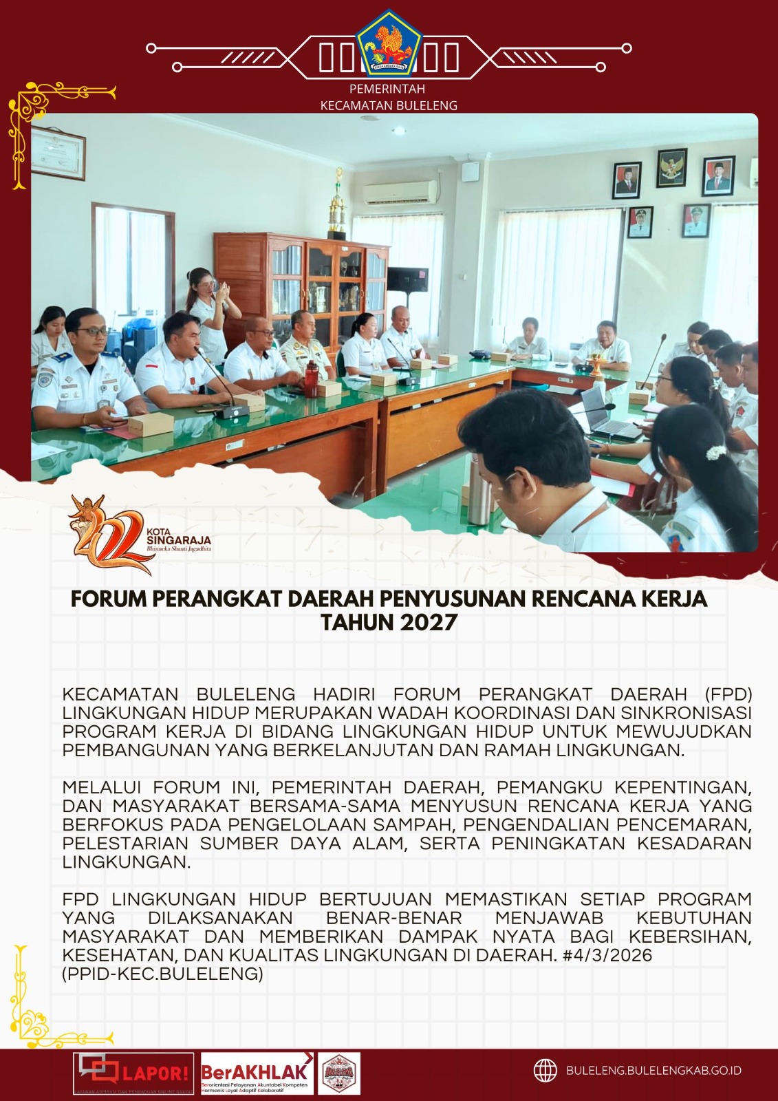 Kecamatan Buleleng hadiri Forum Perangkat Daerah (FPD) Lingkungan Hidup merupakan wadah koordinasi dan sinkronisasi program kerja di bidang lingkungan hidup untuk mewujudkan pembangunan yang berkelanjutan dan ramah lingkungan.