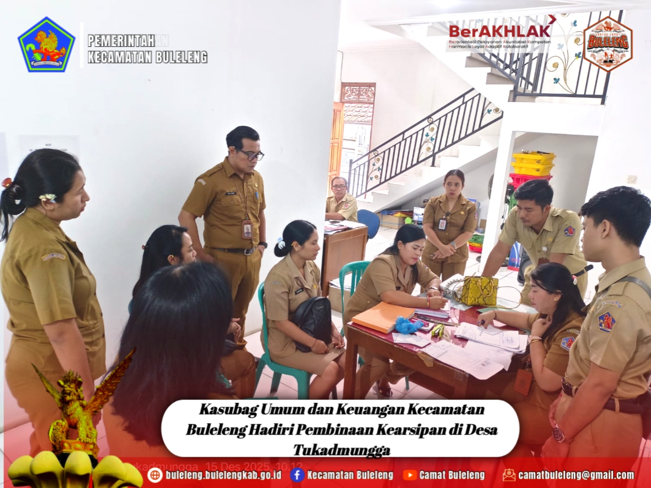 Senin, 15 Desember 2025, Kasubag Umum dan Keuangan Kecamatan Buleleng Putu Tegeh Koriadi, S.E., M.Si bersama staf kearsipan Kecamatan Buleleng menghadiri kegiatan pembinaan kearsipan melalui pemberkasan dan pembuatan daftar isi berkas yang diselenggarakan oleh Dinas Arsip dan Perpustakaan Daerah Kabupaten Buleleng. Kegiatan tersebut bertempat di Kantor Desa Tukadmungga.