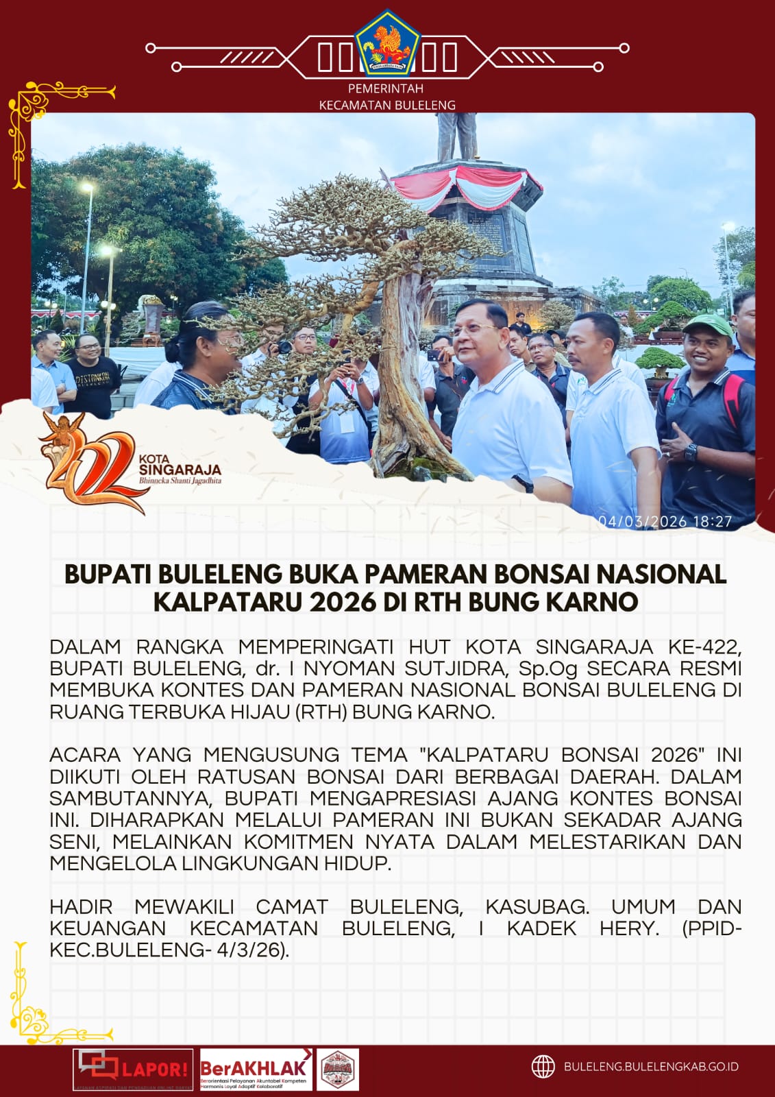 Dalam rangka memperingati HUT Kota Singaraja ke-422, Bupati Buleleng, dr. I Nyoman Sutjidra, Sp.Og secara resmi membuka Kontes dan Pameran Nasional Bonsai Buleleng di Ruang Terbuka Hijau (RTH) Bung Karno.