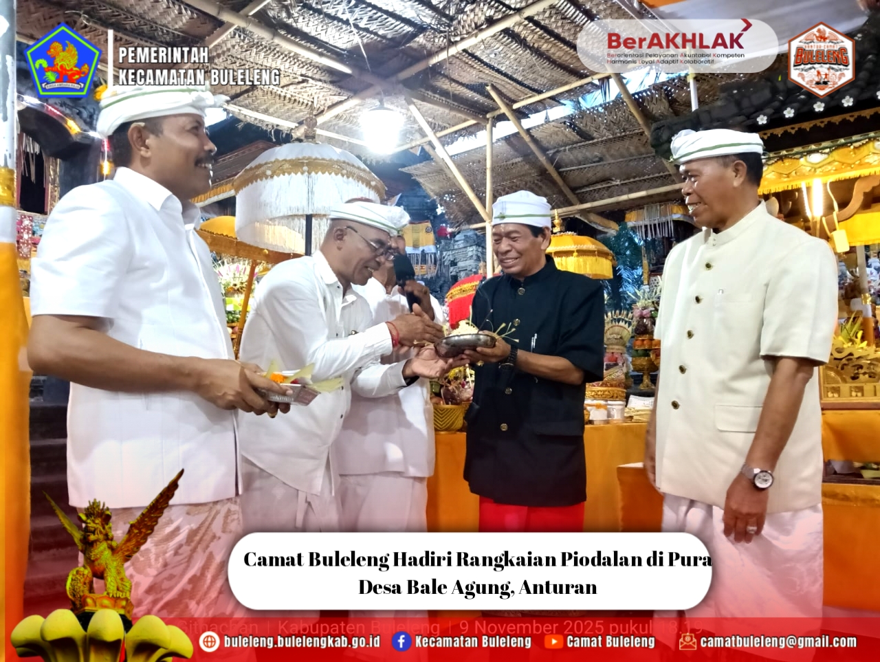 Anturan, Minggu (9/11/2025) — Camat Buleleng, Putu Gopi Suparnaca, S.Sos, mewakili Bupati Buleleng menghadiri uleman rangkaian piodalan di Pura Khyangan Tiga – Pura Desa Bale Agung, Desa Adat Anturan.
