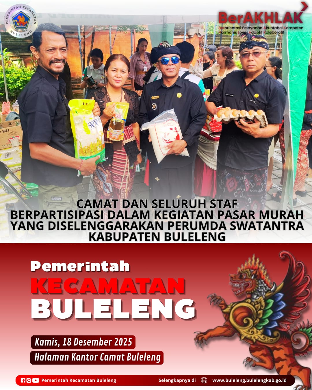 Buleleng, Kamis (18/12/2025) — Camat Buleleng Putu Gopi Suparnaca, S.Sos bersama para Kepala Seksi, Kasubag, serta seluruh staf Kecamatan Buleleng turut berpartisipasi dalam kegiatan Pasar Murah yang diselenggarakan oleh Perumda Swatantra Kabupaten Buleleng. Kegiatan tersebut berlangsung di Halaman Kantor Camat Buleleng dan mendapat antusiasme dari masyarakat setempat.