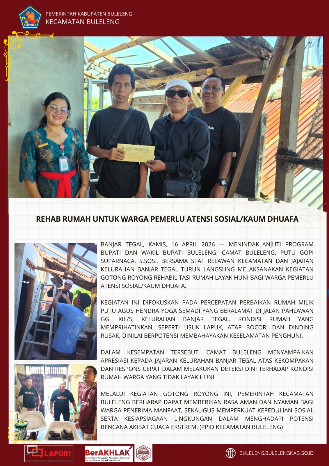 Banjar Tegal, Kamis, 16 April 2026. Menindaklanjuti program Bupati dan Wakil Bupati Buleleng, Camat Buleleng, Putu Gopi Suparnaca, S.Sos., bersama staf relawan kecamatan dan jajaran Kelurahan Banjar Tegal turun langsung melaksanakan kegiatan gotong royong rehabilitasi rumah layak huni bagi warga pemerlu atensi sosial/kaum dhuafa.