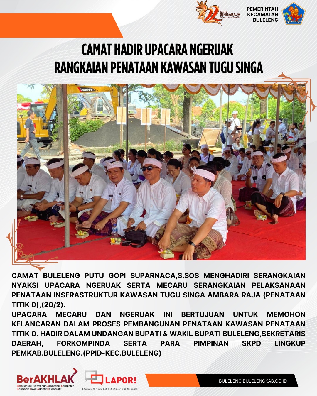 Camat Buleleng Putu Gopi Suparnaca,S.Sos menghadiri serangkaian nyaksi upacara ngeruak serta mecaru dalam rangka pelaksanaan penataan infrastruktur kawasan Tugu Singa Ambara Raja penataan titik Nol, (20/2).