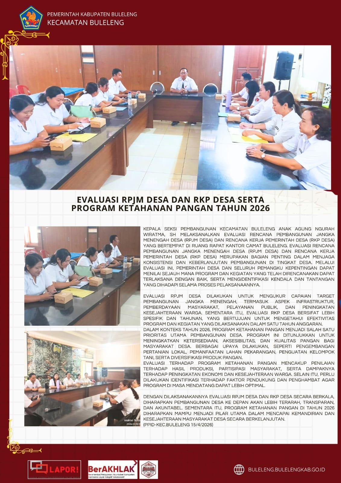 Dengan dilaksanakannya evaluasi RPJM Desa dan RKP Desa secara berkala, diharapkan pembangunan desa ke depan akan lebih terarah, transparan, dan akuntabel. Sementara itu, program ketahanan pangan di tahun 2026 diharapkan mampu menjadi pilar utama dalam mencapai kemandirian dan kesejahteraan masyarakat desa secara berkelanjutan. (PPID-Kec Buleleng, 15/4/2026).