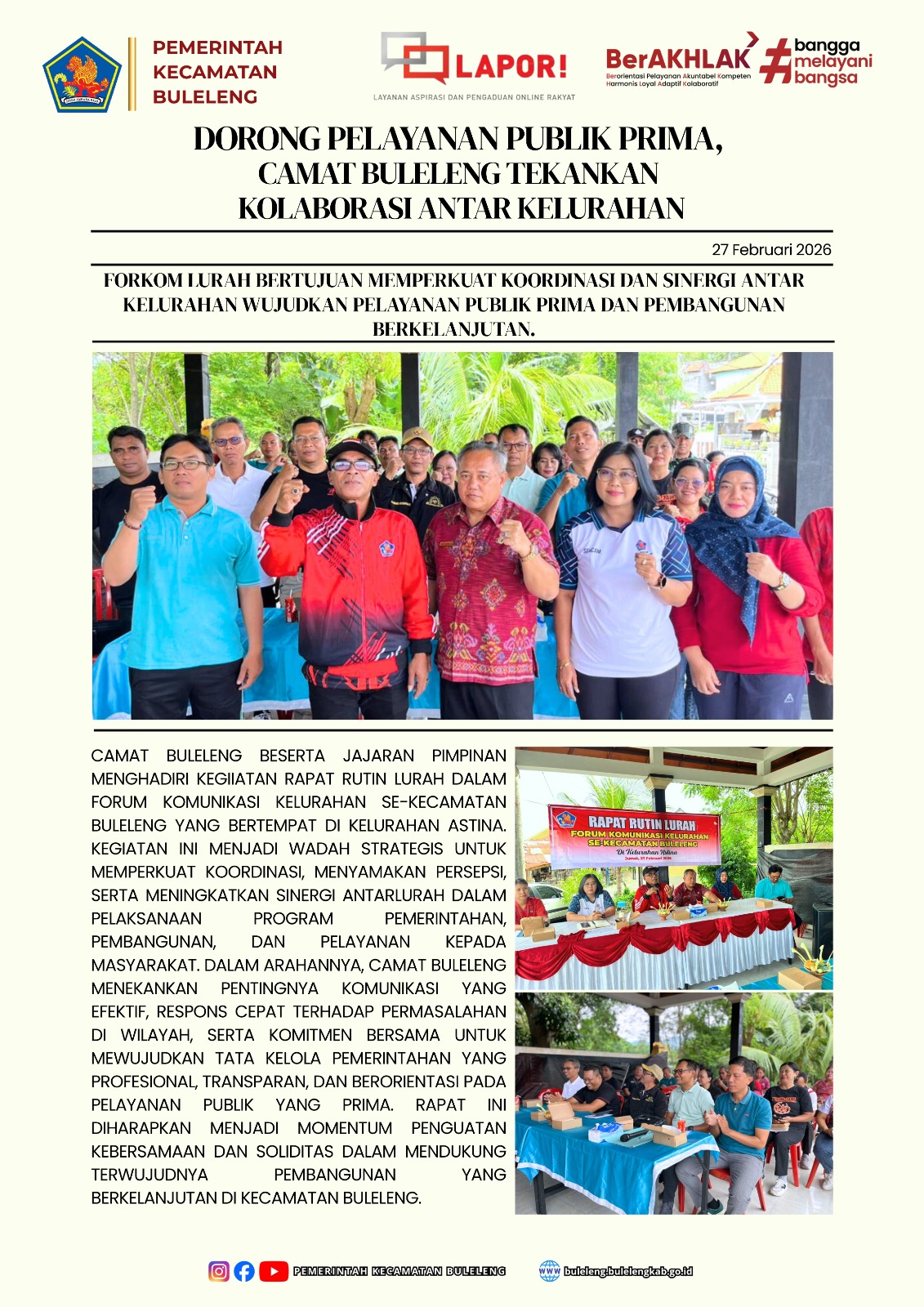 Pimpinan Camat Buleleng beserta jajaran menghadiri kegiatan rapat rutin lurah dalam Forum Komunikasi Kelurahan se-Kecamatan Buleleng yang bertempat di Kelurahan Astina,(27/2).
