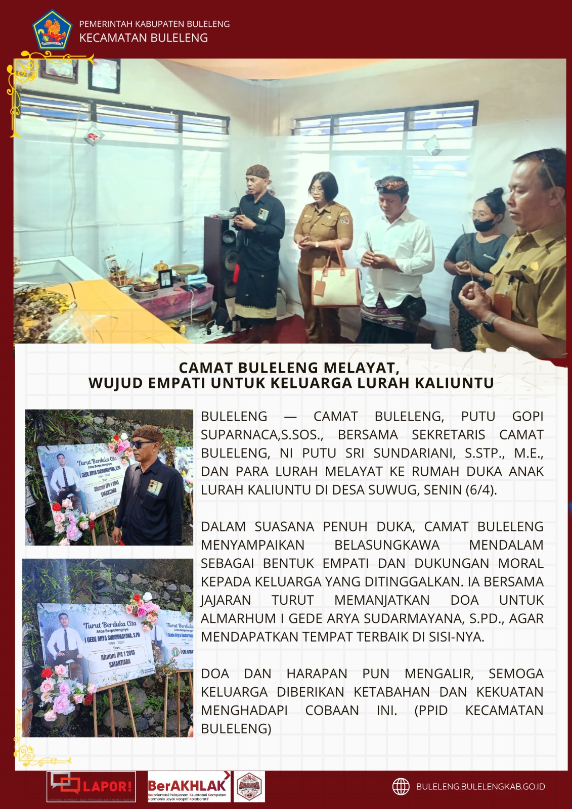 Dalam suasana penuh duka, Camat Buleleng menyampaikan belasungkawa mendalam sebagai bentuk empati dan dukungan moral kepada keluarga yang ditinggalkan. Ia bersama jajaran turut memanjatkan doa untuk almarhum I Gede Arya Sudarmayana, S.Pd., agar mendapatkan tempat terbaik di sisi-Nya.