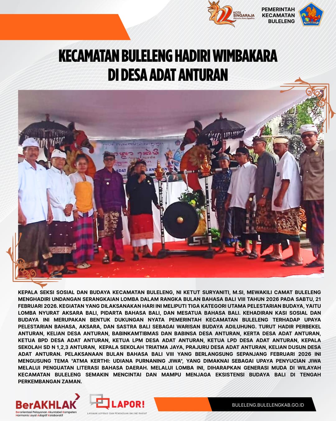 Kepala Seksi Sosial dan Budaya Kecamatan Buleleng, Ni Ketut Suryaniti, M.Si, mewakili Camat Buleleng menghadiri undangan serangkaian lomba dalam rangka Bulan Bahasa Bali VIII Tahun 2026 pada Sabtu, 21 Februari 2026. Kegiatan yang dilaksanakan hari ini meliputi tiga kategori utama pelestarian budaya, yaitu lomba Nyurat Aksara Bali, pidarta Bahasa Bali, dan mesatua Bahasa Bali.
