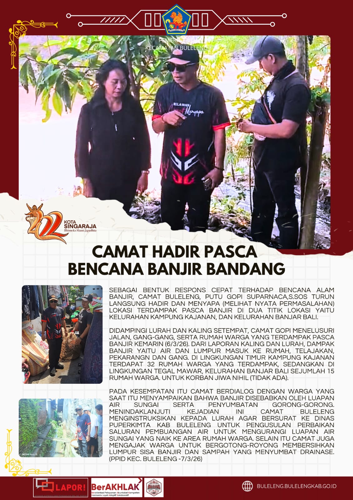 Sebagai bentuk respons cepat terhadap bencana alam banjir, Camat Buleleng, Putu Gopi Suparnaca,S.Sos turun langsung hadir dan menyapa (melihat nyata permasalahan) lokasi terdampak pasca banjir di dua titik lokasi yaitu Kelurahan Kampung Kajanan dan Kelurahan Banjar Bali.