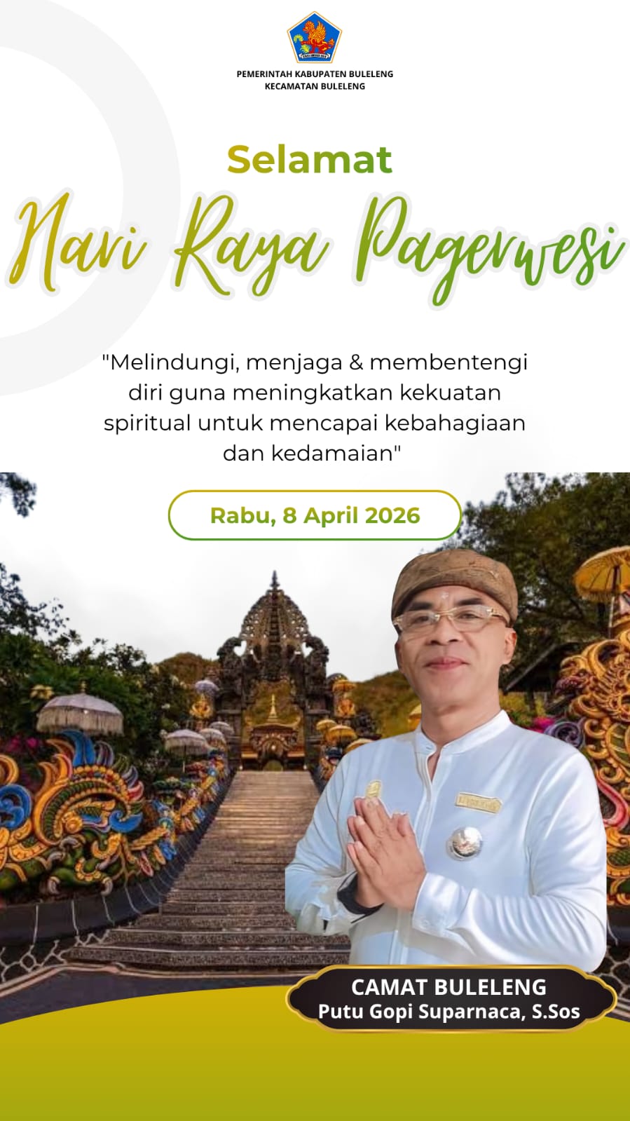 Pemerintah Kecamatan Buleleng mengucapkan selamat Hari Raya Pagerwesi, semoga Ida Sang Hyang Widhi Wasa melindungi,menjaga, dan membentengi diri guna meningkatkan kekuatan spiritual untuk mencapai kebahagiaan dan kedamaian.