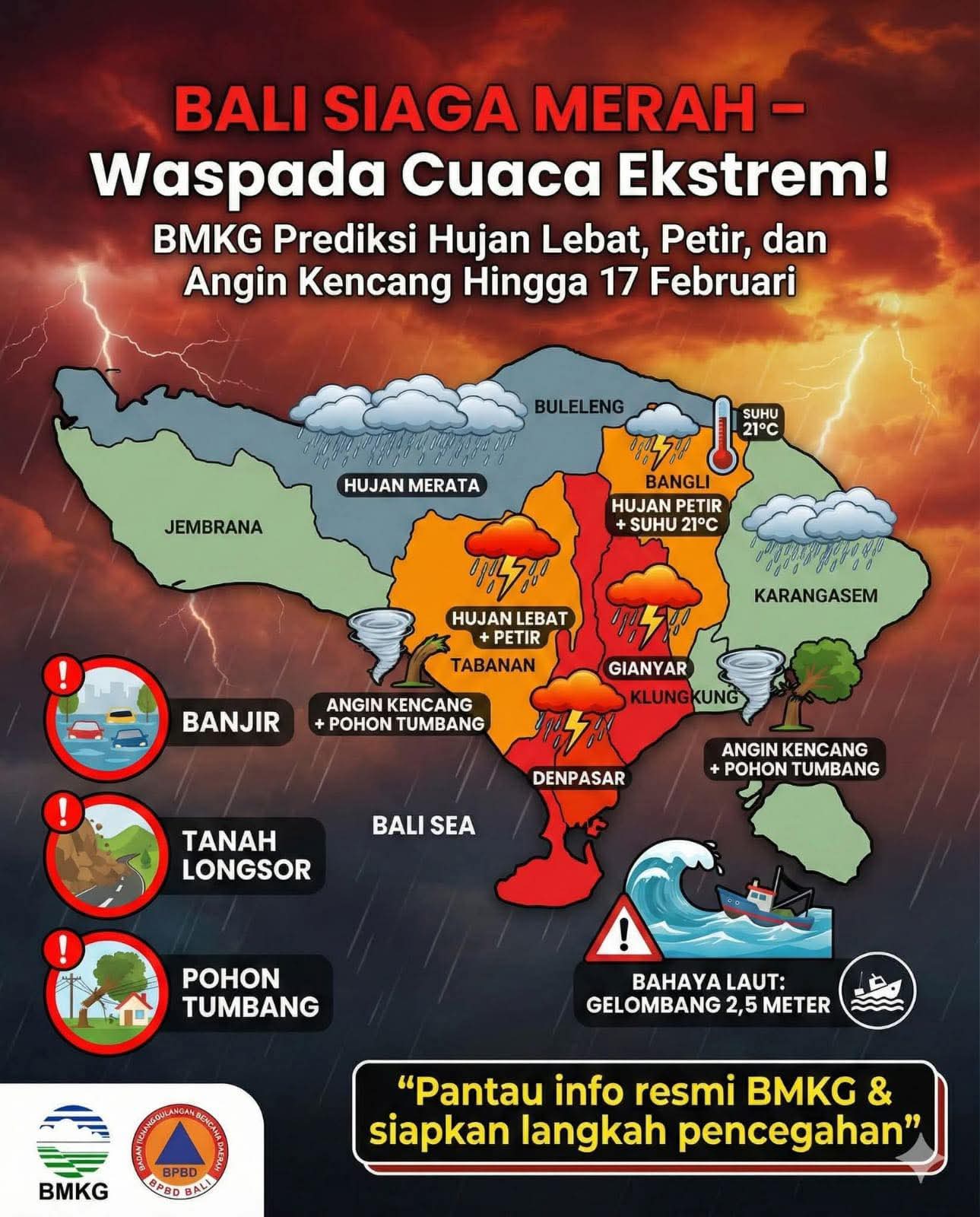 Bali Siaga Merah, Waspada Cuaca Ekstrem BMKG prediksi hujan lebat, petir dan angin kencang hingga 17 Februari 2026