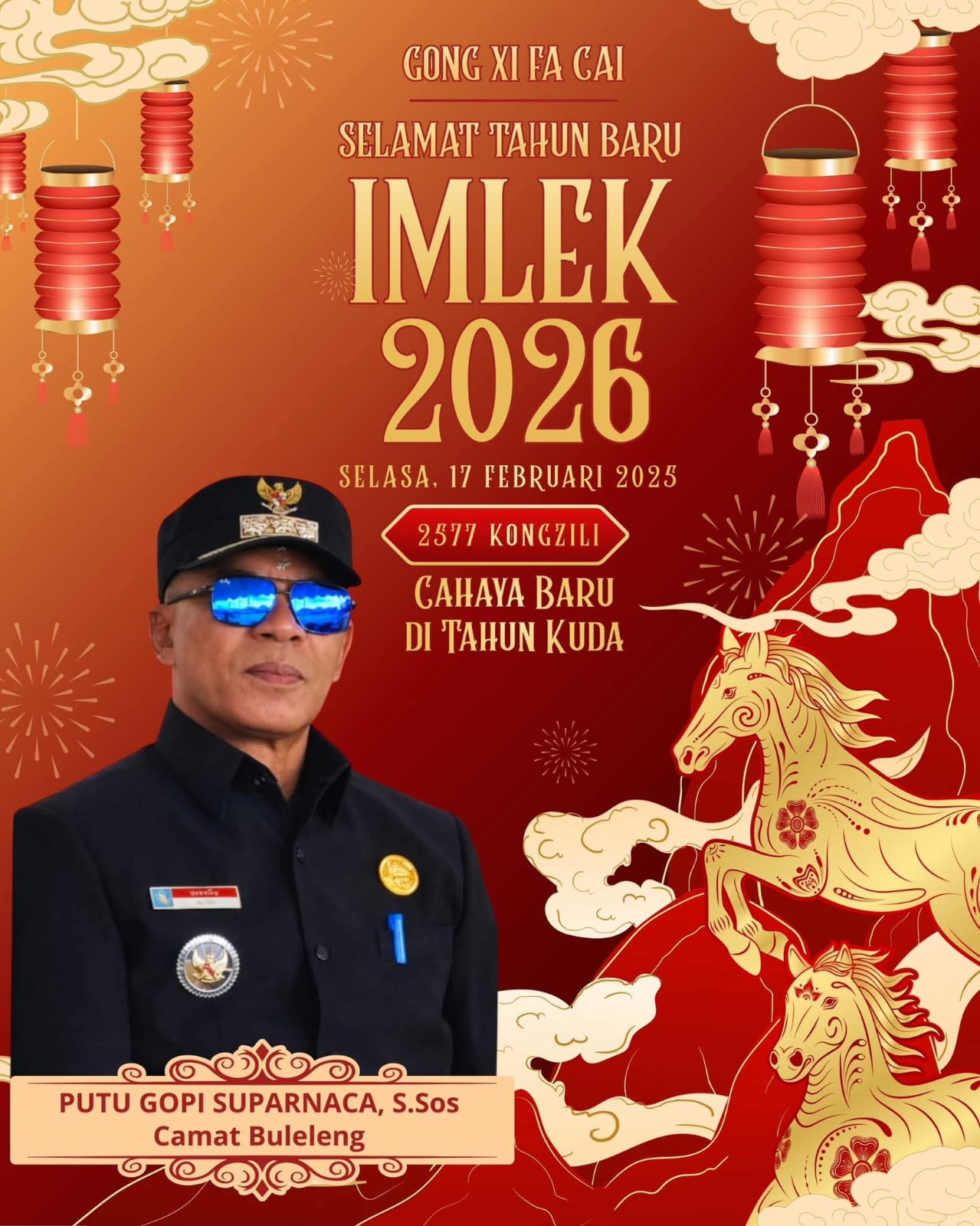 Pemerintah Kecamatan Buleleng mengucapkan Selamat Tahun Baru Imlek 2026, Semoga tahun baru ini membawa keberuntungan, kebahagiaan, dan kesuksesan. Gong Xi Fa Cai!